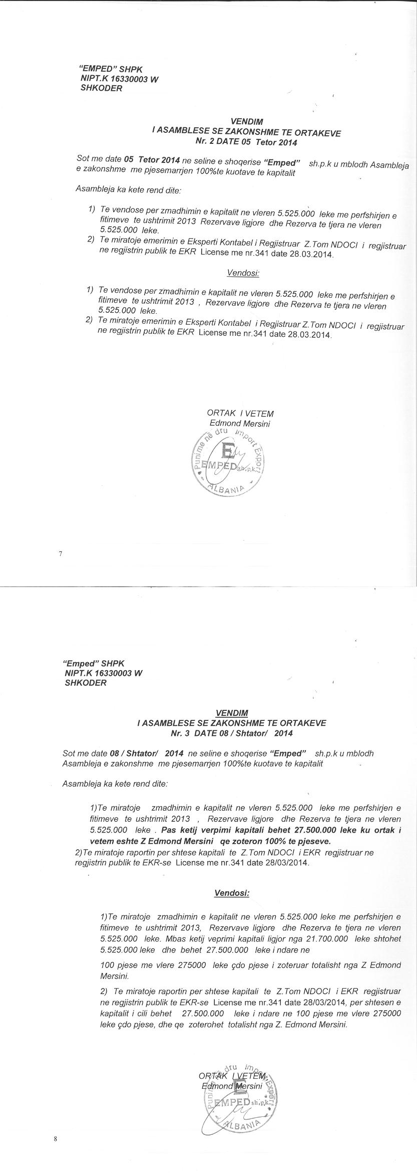 → Ekstrakti Historik i Regjistrit Tregtar date 16.08.2024 → Statuti fillesatar i shoqerise dhe dokumenta te ndryshme → Statuti i perditesuar i shoqerise → Vendim i Asamblese se zakonshme te ortakeve date 02.05.2012 → Vendim i Asamblese se zakonshme te ortakeve date 05.10.2014 |