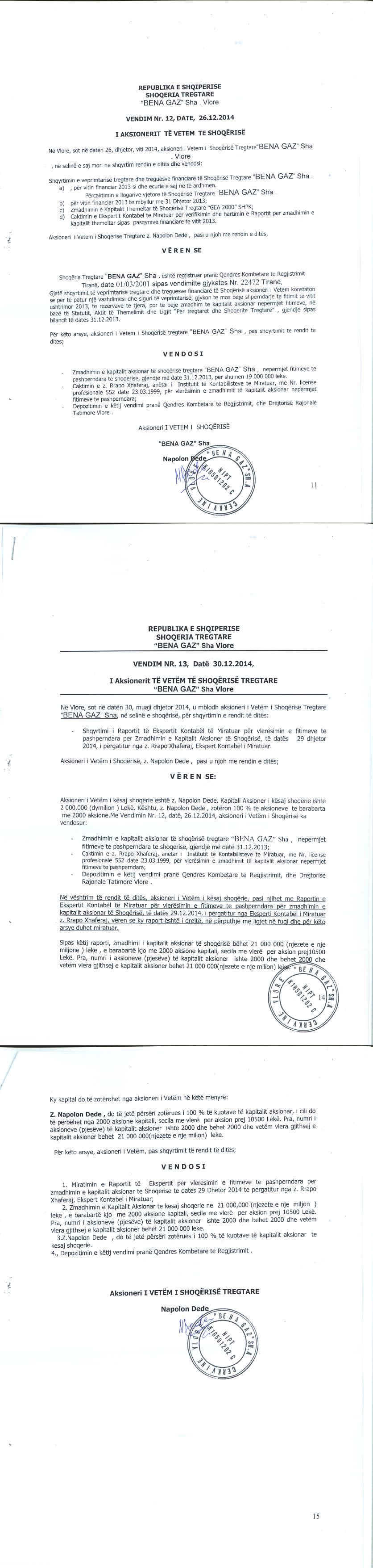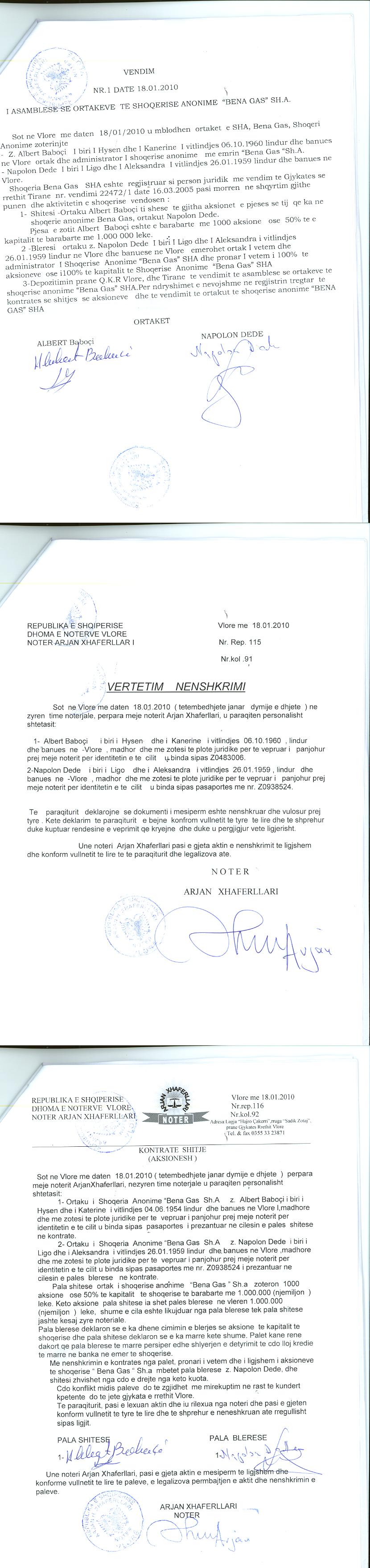 | Çështje Ligjore: | I. Me date 18/08/2015, me ane te Prokures Nr. 2154 Rep. 1472 Kol. date 06.08.2015, leshuar nga z. Napolon Dede ne cilesine e administratorit te shoqerise "BENA - GAS" sh.a, mbi bazen e se ciles perfaqesueses zj.Kozeta Dede i jepen tagrat e percaktuara ne kete akt. II. Me date 15/05/2018, me ane te Urdhrit Nr. 84-Regj, datë 09.05.2018 , protokolluar ne QKB me Nr. 5393Prot date 11.05.2018, lëshuar nga permbarues gjyqesor Shefik Suparaku, u urdherua vendosja e mases se sekuestros konservative mbi aksionet/ kuotat e debitorit shoqeria “BENA –GAS sha Nipt K16501202C me administrator z. Napolon Dede si dhe te drejtat qe rrjedhin nga zoterimi i ketyre aksioneve/kuotave duke ndaluar tjetersimin dhe/ose disponimin e tyre. III. Me date 23/05/2018, me ane te Urdherit Nr. 84-10 Regj., date 14.05.2018, leshuar nga Permbaruesi Gjyqesor Privat Shefik Suparaku u urdherua mosvendosja e mases se sekuestros mbi aksionet/kuotat e debitorit, shoqeria BENA - GAS sh.a me NiptK16501202C me admnistrator Napolon Dede te vendosur ne zbatim te shkreses Nr. 84-5 Regj., datë 09.05.2018 dhe ne rast se sekuetroja eshte vendosur te hiqet. |
