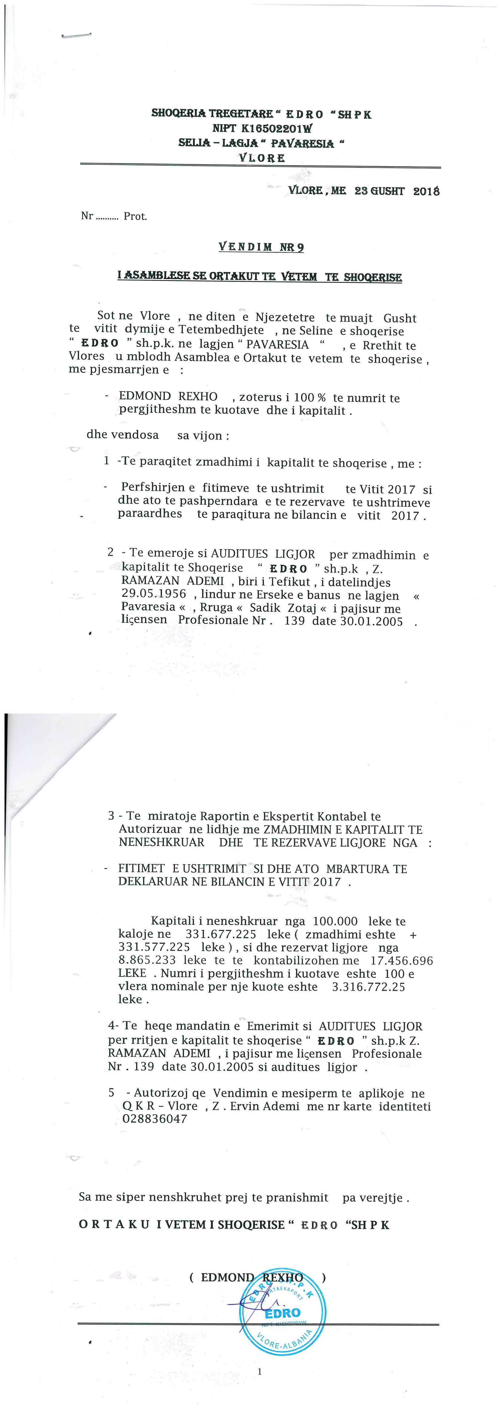 → Ekstrakt historik i regjistrit tregtar 13.01.2021 → Akti i themelimit → Vendimi i asamblese se ortakut per zmadhimin e kapitalit 23.08.2018 |