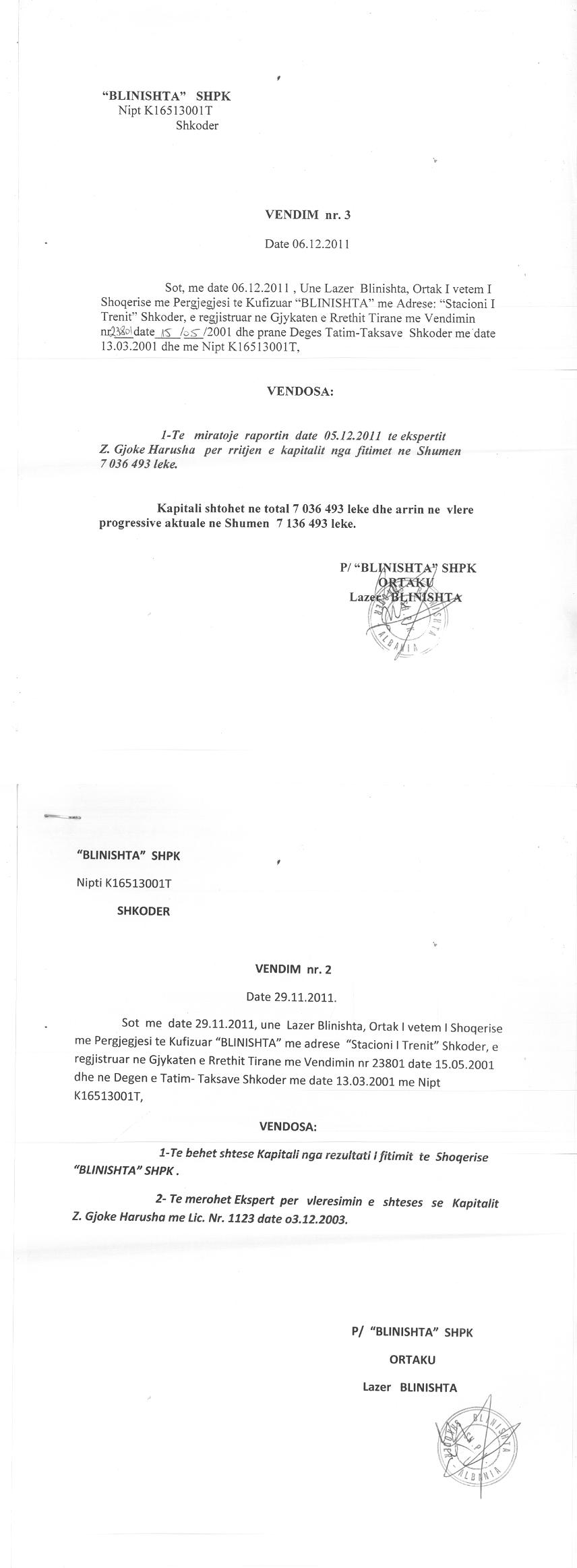 → Ekstrakt historik i regjistrit tregtar 05.07.2021 → Statuti i shoqerise → Vendimi i ortakut te vetem per shtimin e kapitalit date 06.12.2011 → Vendimi i ortakut te vetem per shtimin e kapitalit date 17.05.2013 → Ekstrakt historik i regjistrit tregtar date 30.08.2025 |