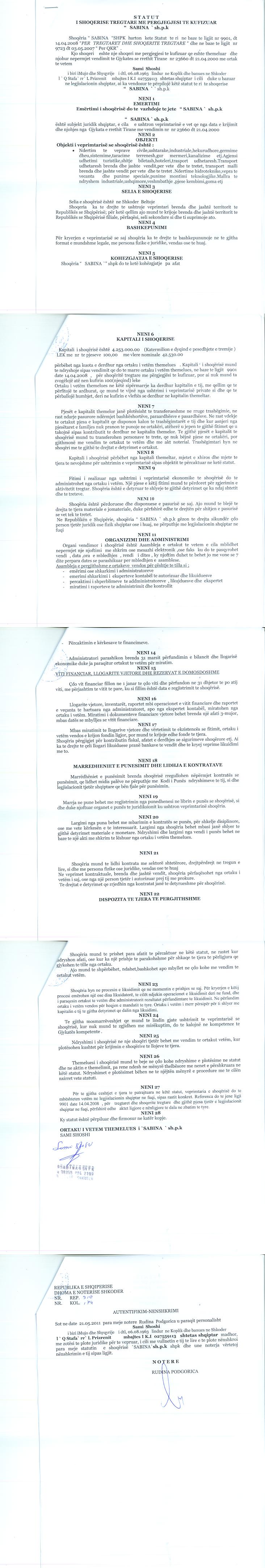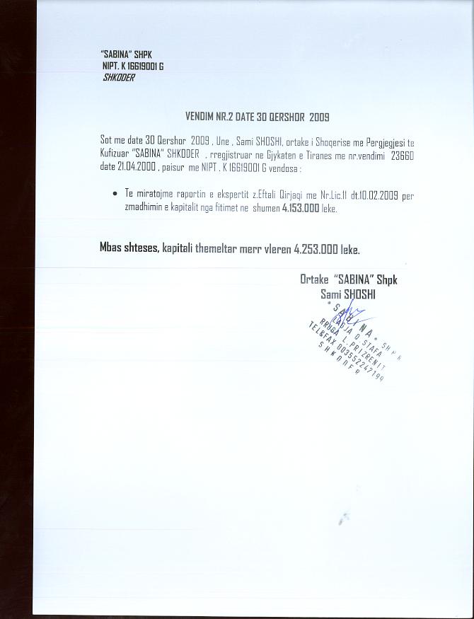→ Ekstrakti Historik i Regjistrit Tregtar date 04.11.2021 → Statuti i Shoqerise → Vendim per ndryshimin e zoteruesit ne datat 07.02.2001 dhe 27.10.2006 → Vendim i Asamblese se Pergjithshme per rritjen e kapitalit date 30.06.2009 |