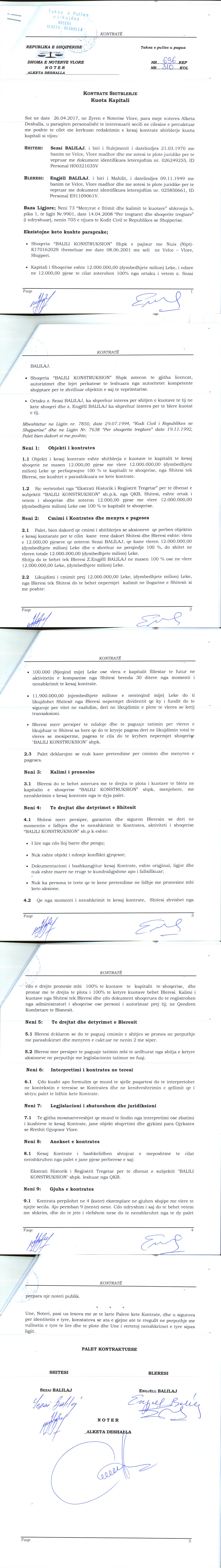| Çështje Ligjore: | I. Me date 06.11.2015, me ane te urdherit Nr. 13114 Prot Nr. Dosje 333, protokolluar nga QKR, me Nr. 10072 Prot, date: 09.11.2015, lëshuar nga shoqeria permbarimore “ CORRECTOR” shpk, u urdherua vendosja e sekuestros mbi kuotat qe zoteron debitori “ Balili Konstruksion”, me NUIS K17016202S, duke ndaluar disponimin ose tjetersimin e tyre si dhe ushtrimin e te drjtave qe rrjedhin nga keto kuota. II. Me date 16.11.2015, me ane te urdhrit Nr. 13947 Prot., Nr. Dosje 333, protokolluar nga QKR me Nr.10382 Prot., date 17.11.2015, lëshuar nga Shoqëria Permbarimore “Corrector” shpk, u urdherua vendosja e masës së sekuestros konservative mbi kuotat që zotërojnë debitorët, Z. Sezai Balilaj në subjektin “Balili Konstruksion”shpk, me Nuis (Nipt) K17016202S,duke ndaluar disponimin ose tjetërsimin etyre, si dhe ushtrimin e të drejtave që rrjedhin nga këto kuota. III. Me date 18.04.2017, me ane te Vendimit Nr. 4676 Prot, leshuar nga shoqeria permbarimore "CORRECTOR" Shpk, u vendos pushimi i ekzekutimit te "Urdhrit te Ekzekutimit" Nr. 891 Akti, date 27.10.2011 te Gjykates se Rrethit Gjyqesor Vlore, leshuar per titullin ekzekutiv, kontrate kredie date 26.02.2008, pasi vendimi eshte ekzekutuar teresisht. IV. Me date 18.04.2017, me ane te Urdhrit Nr. 4675 Prot, leshuar nga shoqeria permbarimore "CORRECTOR" Shpk, u hoq sekuestro mbi kuotat qe zoteron debitori, Sezai Balilaj ne subjektin "BALILI KONATRUKSION" Shpk, me NUIS (NIPT) K17016202S. V. Me date 18.04.2017, me ane te urdherit Nr. 4516 Prot., Nr. 529 Dosje, lëshuar nga Shoqeria Permbarimore "CORRECTOR" sh.p.k, u urdherua heqja e mases se sekuestros konservative ne kuotat qe zoteron debitori Sezai Balilaj, ne subjektin “BALILI KONSTRUKSION” Sh.p.k pajisur me NUIS (NIPT) - K17016202S. |