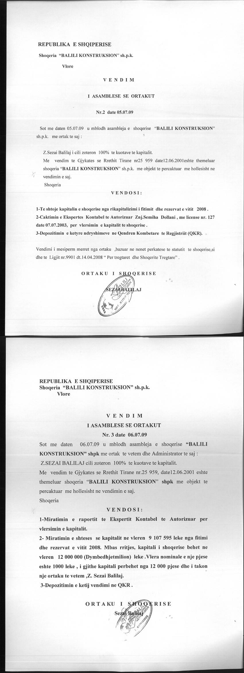 → Ekstrakt historik i regjistrit tregtar 26.06.2021 → Akti i themelimit → Kontrate shitblerje kuotash kapitalit date 26.04.2017 → Vendimi i ortakut te vetem per rritjen e kapitalit date 05.07.2009 → Ekstrakti Historik i Regjistrit Tregtar date 08.05.2023 → Ekstrakt Historik i Regjistrit Tregtar date 24.09.2024 |