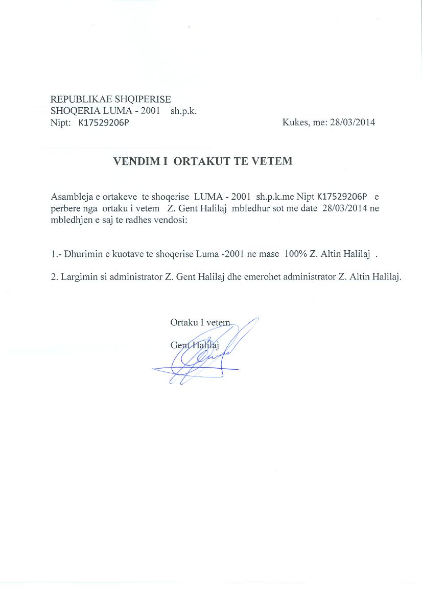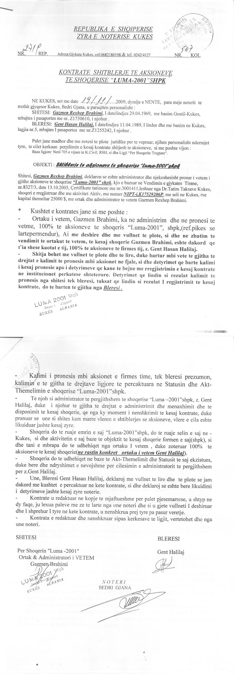 | Çështje Ligjore: | Me date 07.03.2001 eshte vendosur bashkimi me perthithje i shoqerise LUMA( e cila eshte shoqëria përthithëse) me shoqerine KUKESI UNION, ( e cila eshte shoqeria e përthithur).Pas perfundimit te bashkimit , shoqeria perthithese do te kete emrin LUMA 2001, ortak i vetëm dhe adminsitrator i saj eshte Hasan Halilaj, Aktet e krijimt te shoqerise LUMA 2001 do te jene ato te shoqerise LUMA. |