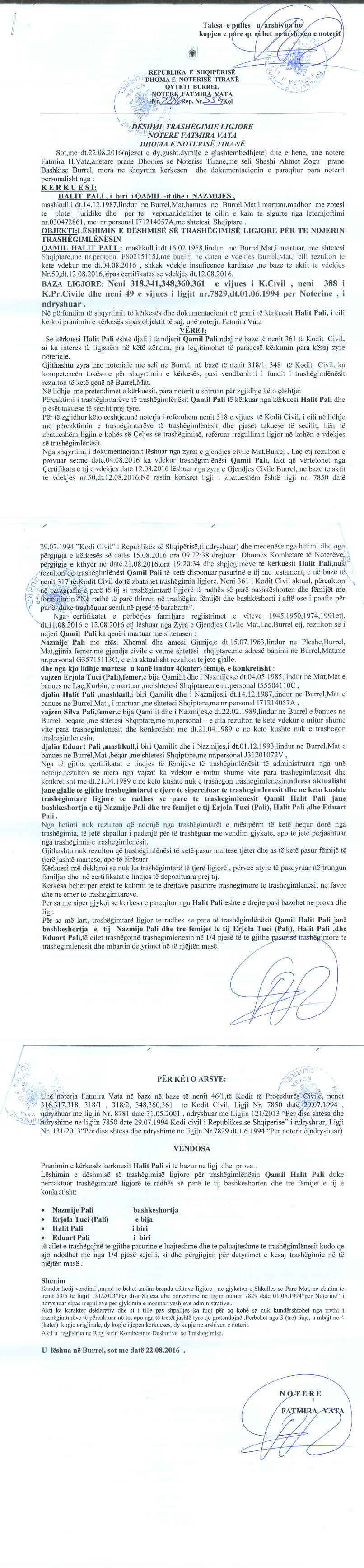 → Ekstrakt historik i regjistrit tregtar date 03.12.2021 → Deshmi trashegimie ligjore date 22.08.2016 |