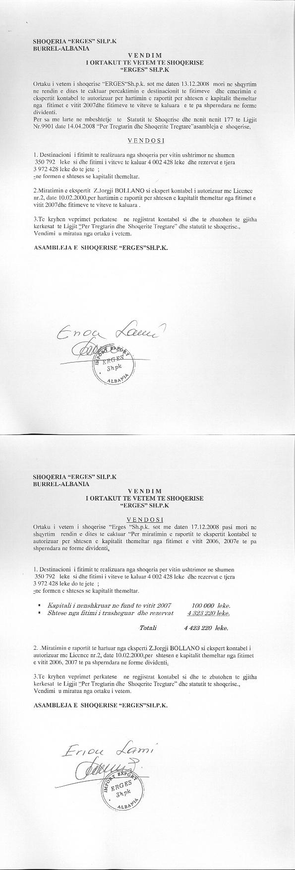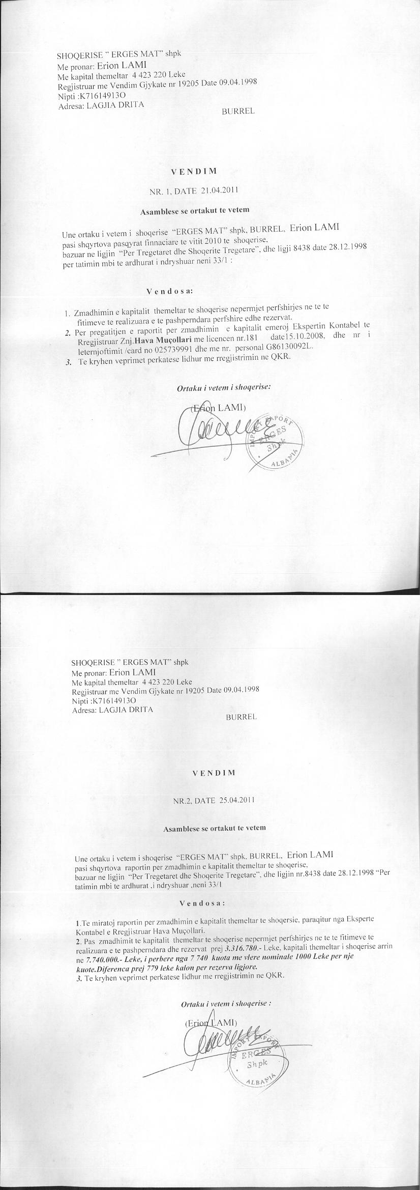 → Ekstrakti Historik i Regjistrit Tregtar date 02.11.2021 → Statuti i Shoqerise → Vendim i ortakut te vetëm per rritjen e kapitalit date 17.12.2008 → Vendim i ortakut te vetëm per rritjen e kapitalit date 25.04.2011 → Vendim i ortakut te vetëm per rritjen e kapitalit date 16.06.2014 → Vendim i ortakut te vetëm per rritjen e kapitalit date 28.07.2017 |