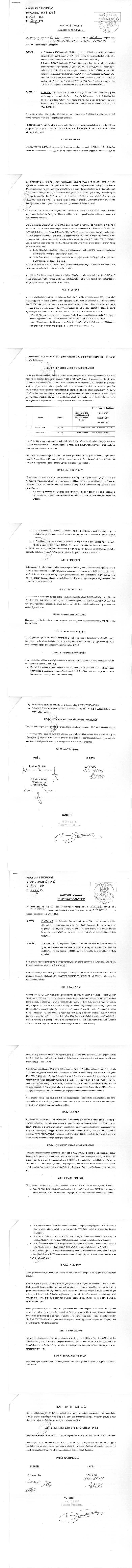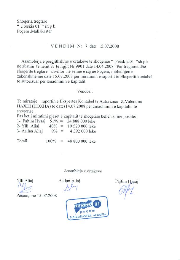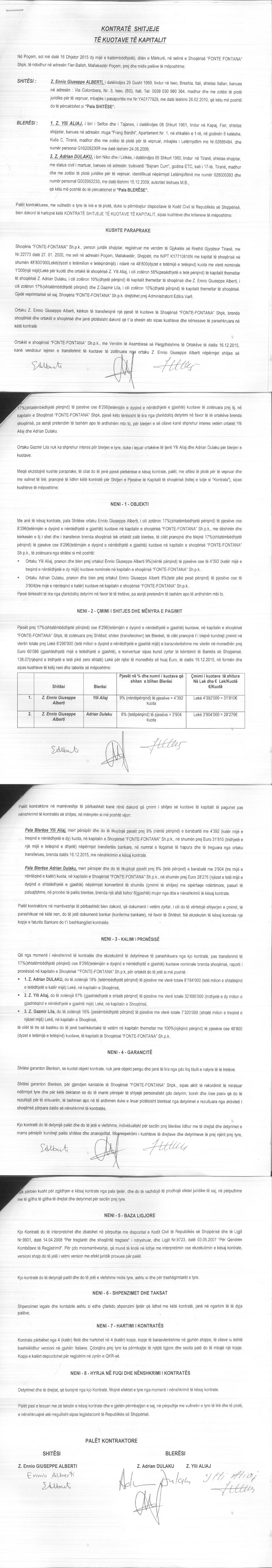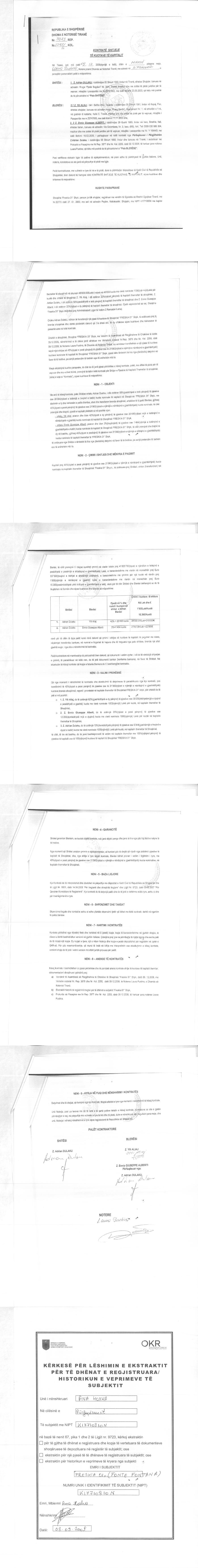 → Ekstrakt Historik i Regjistrit Tregtar date 07.04.2023 → Akt themelimi dhe Statuti i Shoqerise → Kontratë Shitje Kuotash datë 24.10.2001 → Kontratë Shitje Kuotash datë 12.04.2005 → Kontratë Shitje Kuotash datë 24.10.2005 → Kontratë Shitje Kuotash Kapitali datë 06.08.2008 → Kontratë Shitje Kuotash Kapitali datë 09.12.2008 → Kontratë Shitje Kuotash Kapitali datë 28.09.2009 dhe datë 01.10.2009 → Kontratë Shitje Kuotash datë 16.12.2015 → Kontratë Shitje Kuotash datë 22.01.2018 → Vendim i Asamblesë së Përgjithshme, Zmadhim Kapitali datë 15.07.2008 |