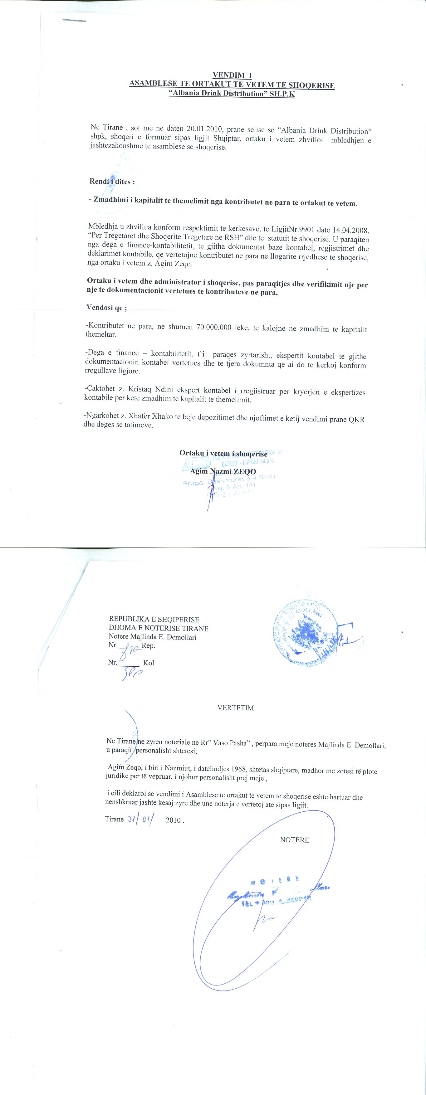→ Ekstrakt Historik i Regjistrit Tregtar date 06.04.2023 → Akt themelimi dhe Statuti i Shoqerise → Kontratë Shitje e Pjesëve të Kapitalit datë 13.04.2004 → Vendim i Ortakut të Vetëm, Zmadhim Kapitali datë 24.05.2005 → Vendim i Ortakut të Vetëm, Zmadhim Kapitali datë 05.06.2006 → Vendim i Asamblesë së Ortakut të Vetëm, Zmadhim Kapitali datë 20.01.2010 → Vendim i Ortakut të Vetëm, Zmadhim Kapitali datë 02.06.2011 → Vendim i Ortakut të Vetëm, Zmadhim Kapitali datë 15.09.2011 → Vendim i Ortaku të Vetëm, Zmadhim Kapitali datë 15.11.2012 → Ekstrakt Historik i Regjistrit Tregtar date 09.08.2023 |