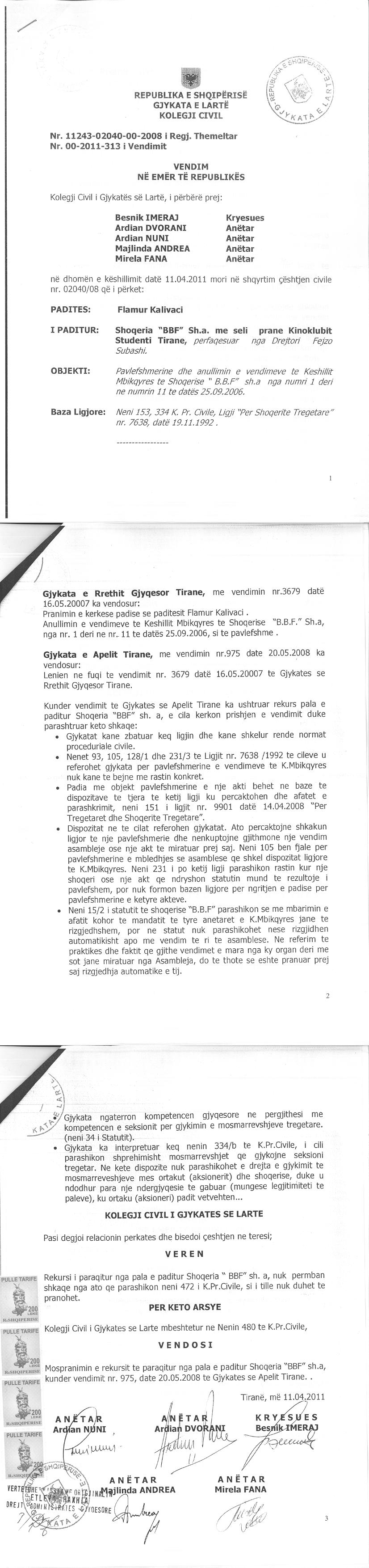 me objekt pavlefshmerine dhe anullimin e vendimeve te Keshillit Mbikeqyres te Shoqerise B.B.F sh.a nga numri 1 deri ne numrin 11 te dates 25.09.2006, me te cilin eshte vendosur mospranimi i rekursit te paraqitur nga pala e paditur Shoqeria B.B.F sh.a kunder vendimit nr.975, date 20.05.2008 te Gjykates se Apelit Tirane. II. Me date 11.02.2020, me ane te vendimit Nr.108 te Gjykates se Apelit Tirane, u vendos konsatatimi i pavlefshem i vendimit nr.7245 date 07.09.2017, te Gjykates se Rrethit Gjyqesor Tirane, duke vendosur konstatimin e pavlefshem te vendimit nr.22 me nr.40 prot., date 16.07.2015 te Asamblese se Pergjithshme te Aksionareve te shoqerise B.B.F sha, duke urdheruar fshirjen e regjistrimeve te bera ne baze te atij vendimi ne QKB. |