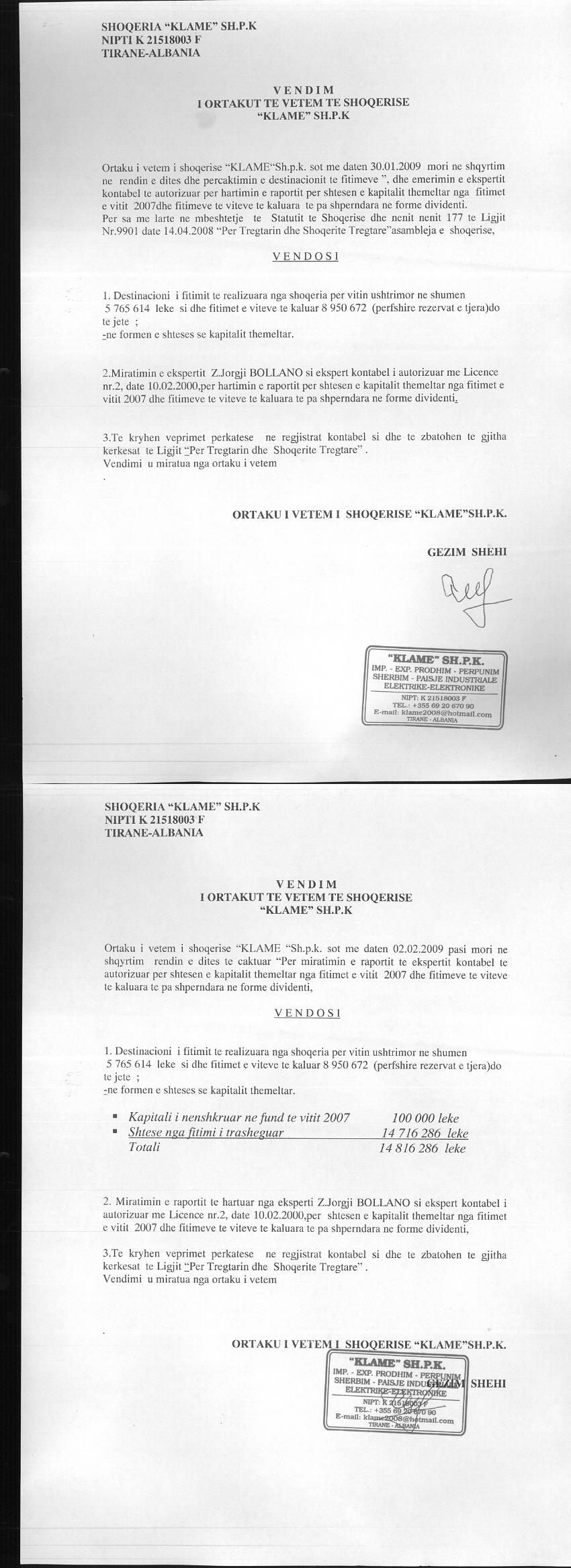 → Ekstrakti Historik i Regjistrit Tregtar date 09.03.2023 → Akt themelimi dhe Statuti i Shoqerise → Vendim i Ortakut te Vetem, Zmadhim Kapitali date 02.02.2009 → Vendim i Ortakut te Vetem, Zmadhim Kapitali date 14.11.2010 |