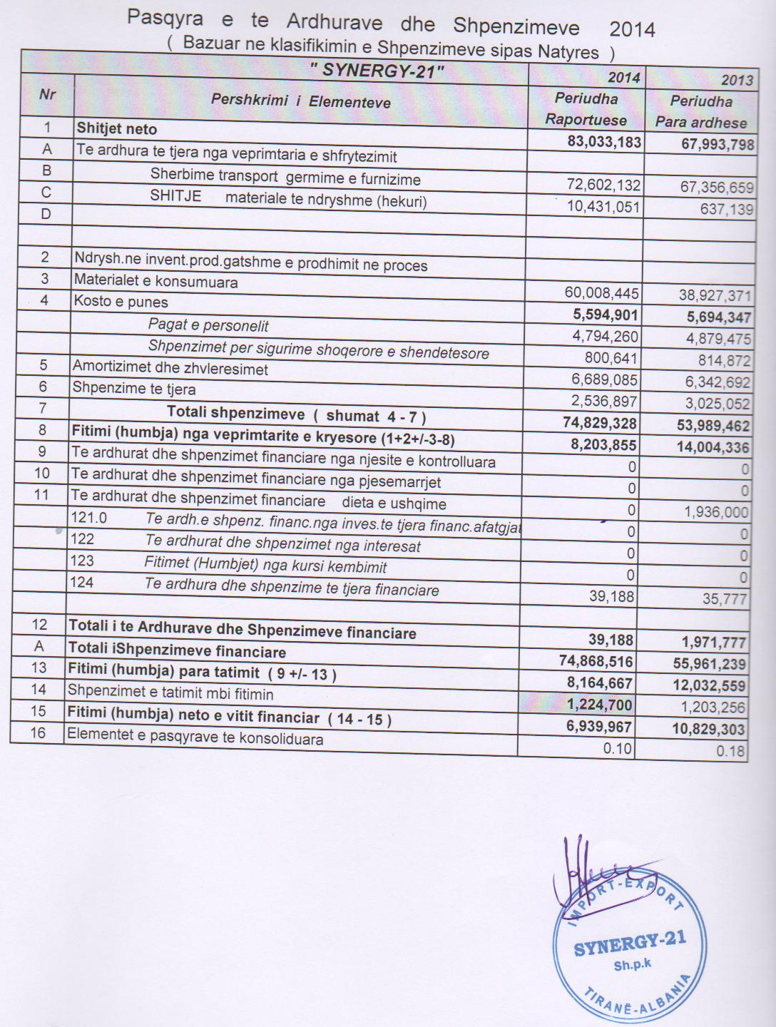 3 791 966,00 Fitimi para Tatimit(Lekë) 2022: 5 547 097,00 Fitimi para Tatimit(Lekë) 2021: 27 808 079,00 Fitimi para Tatimit(Lekë) 2020: 7 882 539,00 Fitimi para Tatimit(Lekë) 2019: 2 271 411,00 Fitimi para Tatimit(Lekë) 2018: 8 834 362,00 Fitimi para Tatimit(Lekë) 2017: 6 913 716,00 Fitimi para Tatimit(Lekë) 2016: 3 896 139,00 Fitimi para Tatimit(Lekë) 2015: 7 211 465,00 Fitimi para Tatimit(Lekë) 2014: 8 164 667,00 Fitimi para Tatimit(Lekë) 2013: 12 032 559,00 Fitimi para Tatimit(Lekë) 2012: 1 605 948,00 Fitimi para Tatimit(Lekë) 2011: 8 401 411,00 Fitimi para Tatimit(Lekë) 2010: 8 868 559,00 |