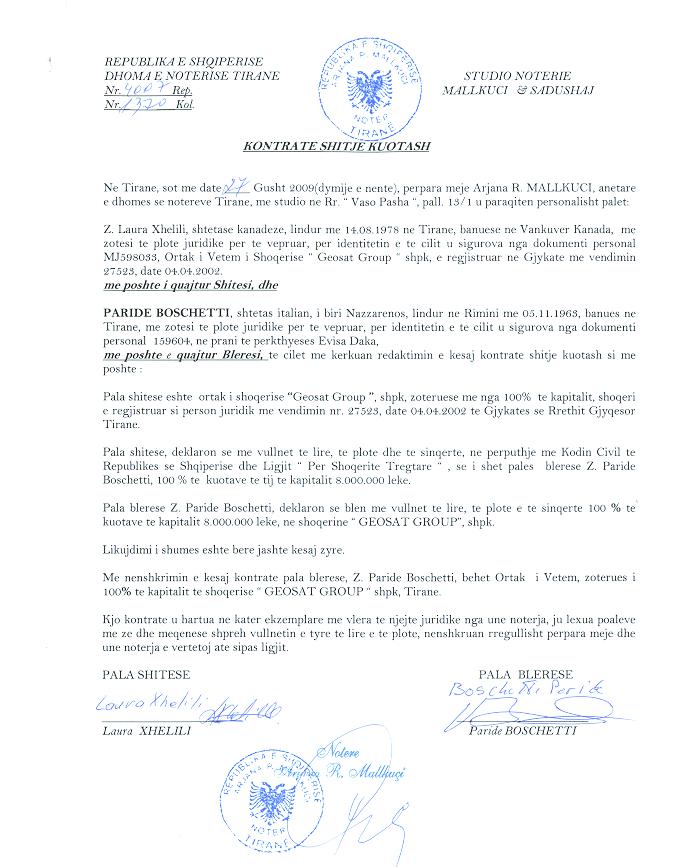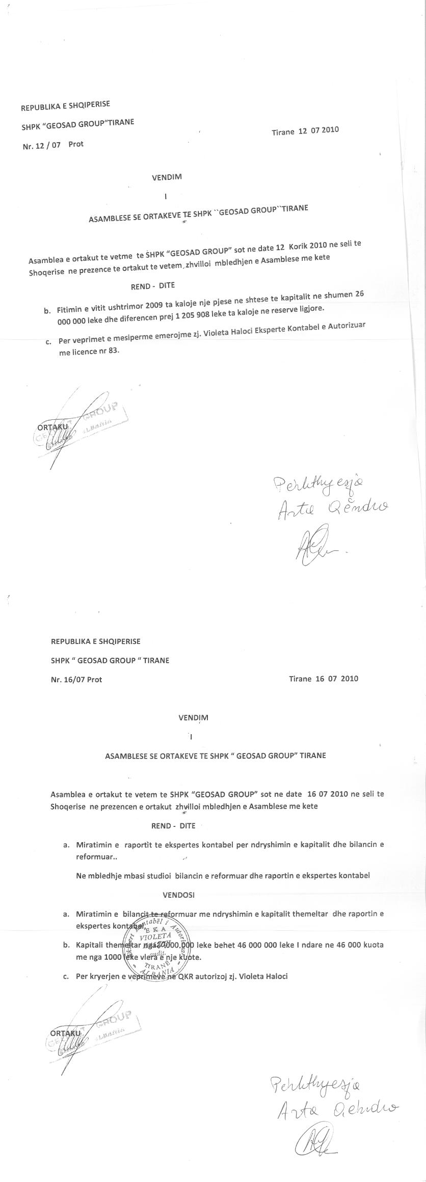→ Ekstrakt historik i regjistrit tregtar 04.10.2021 → Akti i themelimit dhe statuti → Vendimi i ortakut per zmadhimin e kapitalit 20.09.2017 → Kontrate shitje kuotash 28.08.2012 → Kontrate shitje kuotash 09.12.2005 → Kontrate shitje kuotash 26.06.2006 → Kontrate shitje kuotash 21.11.2007 → Kontrate shitje kuotash 12.04.2005 → Kontrate per transferimin e pjeseve te kapitalit 22.11.2005 → Kontrate shitje kuotash 27.08.2019 → Kontrate shitje kuotash 27.11.2014 → Vendimi i asamblese se ortakeve per rritjen e kapitalit 12.07.2010 → Vendimi i asamblese se ortakut per zmadhimin e kapitalit 21.09.2009 → Ekstrakti Historik i Regjistrit Tregtar date 09.05.2023 → Ekstrakti Historik i Regjistrit te Pronareve Perfitues date 09.05.2023 → Ekstrakt Historik i Regjistrit Tregtar date 28.02.2024 → Urdhër për Vënien e Sekuestros datë 11.12.2023 → Urdhër për Heqjen e Sekuestros datë 04.01.2024 → Urdhër për Vënien e Sekuestros datë 15.01.2024 → Ekstrakt Historik i Regjistrit te Pronareve Perfitues date 28.02.2024 → Ekstrakt Historik i Regjistrit Tregtar date 10.06.2024 → Urdhër për Heqjen e Sekuestros datë 25.03.2024 → Ekstrakt Historik i Regjistrit te Pronareve Perfitues date 10.06.2024 |