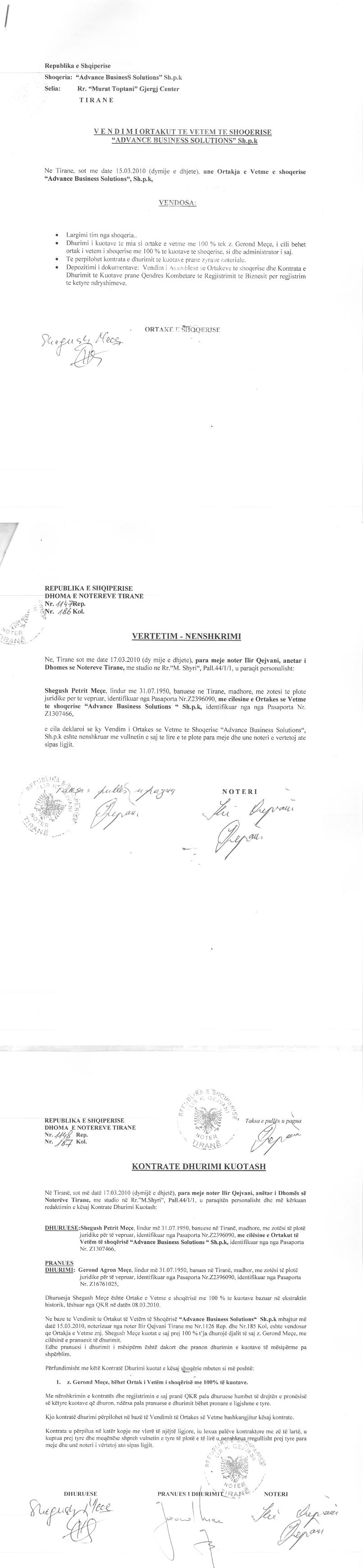 → Ekstrakt historik i regjistrit tregtar 07.06.2022 → Akti i themelimit → Vendim i ortakut te vetem per dhurimin e kuotave date 15.03.2010 → Vendimi i asamblese se pergjithshme date 29.06.2010 per rritjen e kapitalit themeltar → Vendim i asamblese se pergjithshme per rritjen e kapitalit 29.06.2011 → Vendimi i asamblese se pergjithshme per rritjen e kapitalit date 06.12.2017 → Vendimi i asamblese se pergjithshme date 27.01.2019 per rritjen e kapitalit → Vendim i asamblese se pergjithshme per rritjen e kapitalit themeltar 30.06.2014 → Vendim i asamblese se pergjithshme per rritjen e kapitalit themeltar 12.03.2021 → Ekstrakti Historik i Regjistrit Tregtar date 11.04.2023 → Vendim i Ortakut te Vetem, Zmadhim Kapitali date 19.12.2022 → Ekstrakt Historik i Regjistrit Tregtar date 05.02.2025 |