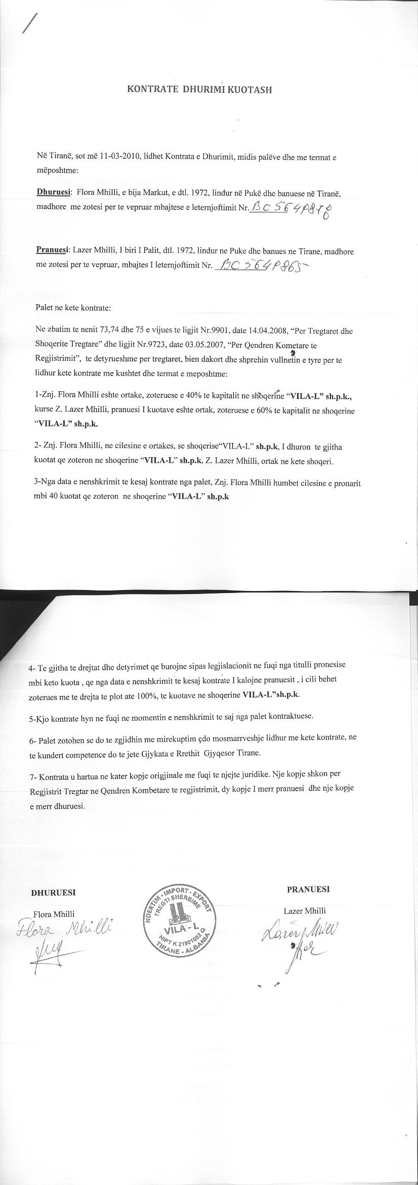| Çështje Ligjore: | I.Me date 20.08.2012, eshte depozituar urdheri Nr.01748/4 Prot, leshuar nga Shoqeria Permbarimore Private HOTI BAILIFF SERVICE, ku eshte urdheruar: “Vendosja e mases se sekuestros konservative mbi kapitalin e regjistruar te pales debitore shoqeria “VILA - L” sh.p.k me NUIS (NIPT)- K21901002Q me perfaqesues ligjor Lazer Mhilli per Ekzekutimin e Urdherit te Ekzekutimit” Nr.1948, date 14.02.2012 te Gjykates se Rrethit Gjyqesor Tirane, deri ne nje urdher te dyte nga Permbaruesi Gjyqesor. II. Me date 08.10.2012, eshte depozituar urdheri Nr.01748/6 Prot, "Per Heqjen e Sekuestros Konservative", leshuar nga Shoqeria Permbarimore “HOTI BAILIFF SERVICE” sh.p.k., ku eshte urdheruar:Heqja e mases se sekuestros konservative mbi kuotat e regjistruara ne emer te pales debitore: Shoqeria “VILA - L “shpk, me NUIS(NIPT) K21901002Q dhe administrator Z. Lazer Mhilli, per ekzekutimin e “Urdhrit te Ekzekutimit” nr. 1948, date 14.02.2012, te Gjykates Rrethit Gjyqesor Tirane. |