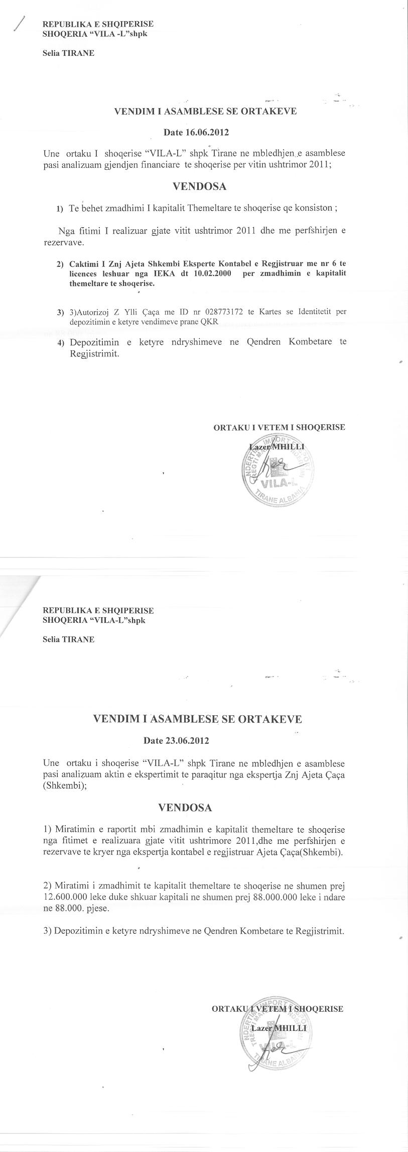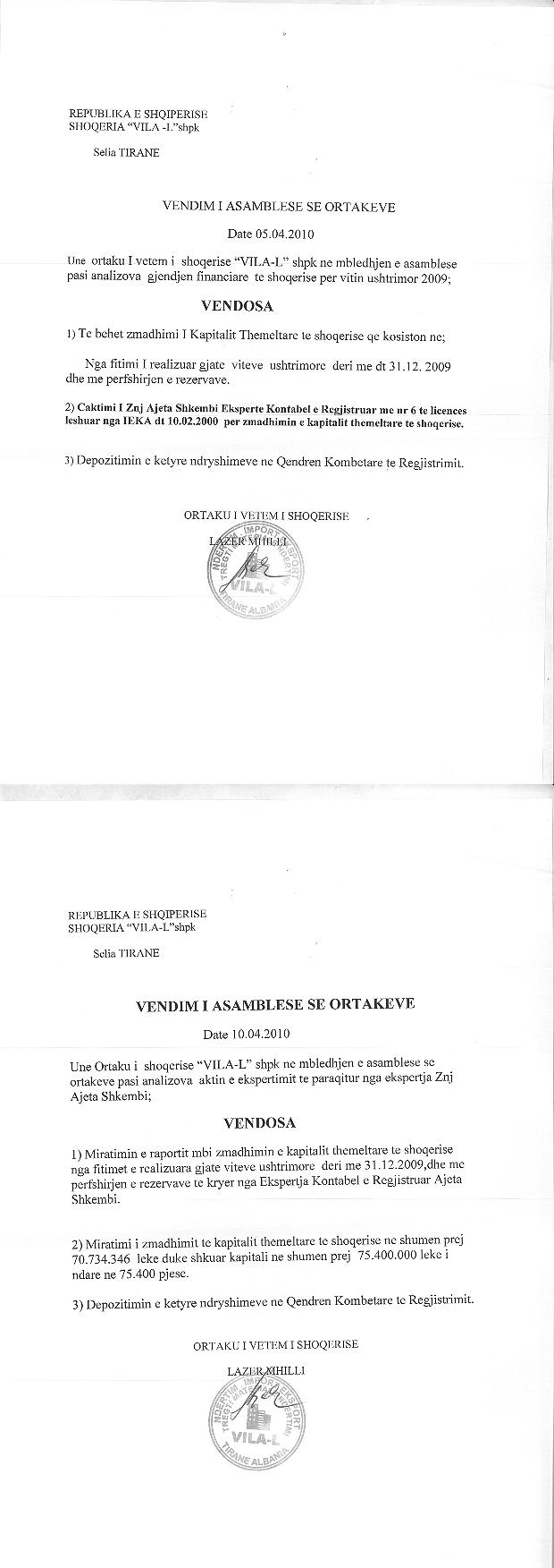 → Ekstrakti Historik i Regjistrit Tregtar date 22.02.2022 → Statuti i Shoqerise → Kontrate e Dhurimit te Kuotave date 11.03.2010 → Vendim i asamblese se ortakeve date 05.04.2010 → Vendim i asamblese se ortakeve date 23.06.2012 → Vendim i asamblese se ortakeve date 21.11.2013 → Vendim i asamblese se ortakeve date 28.07.2015 → Vendim i asamblese se ortakeve date 21.07.2017 |