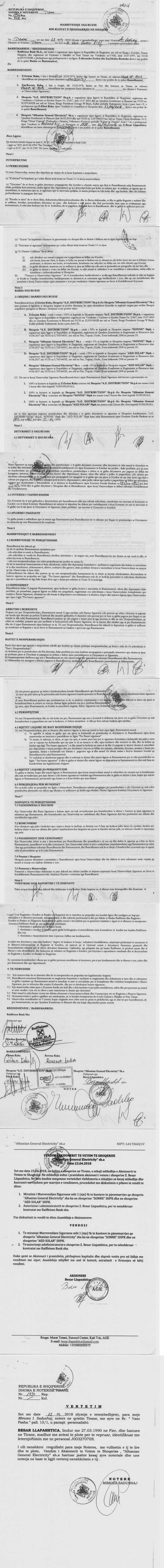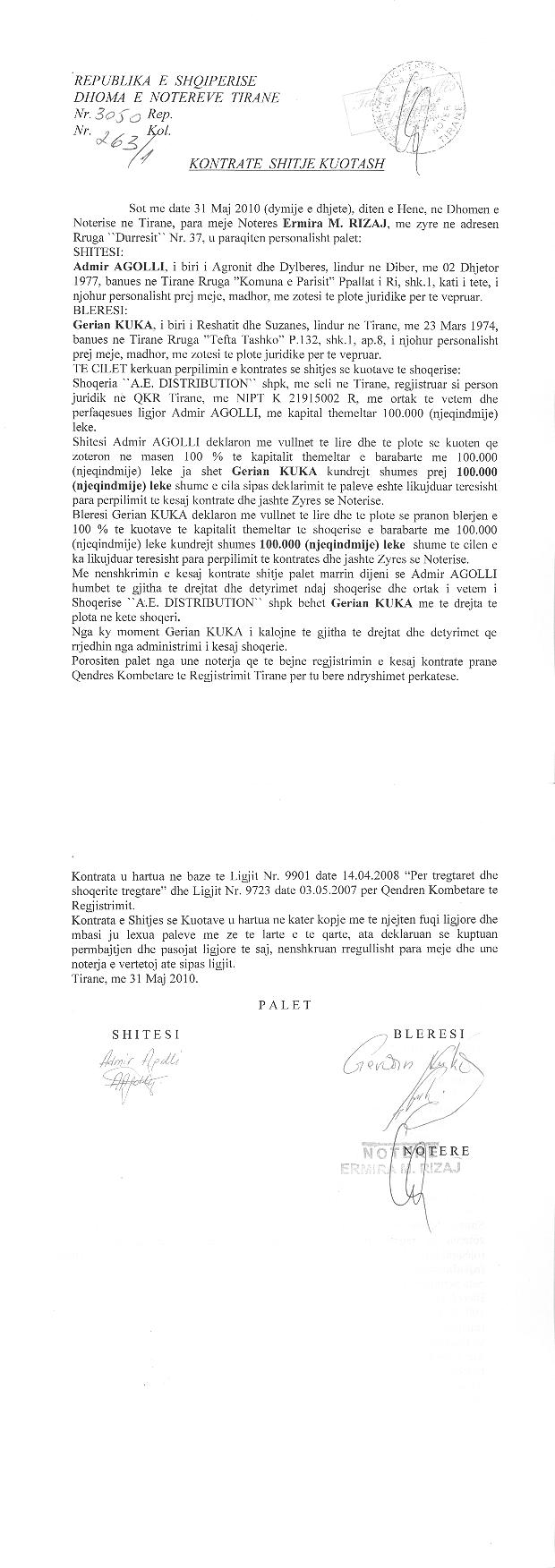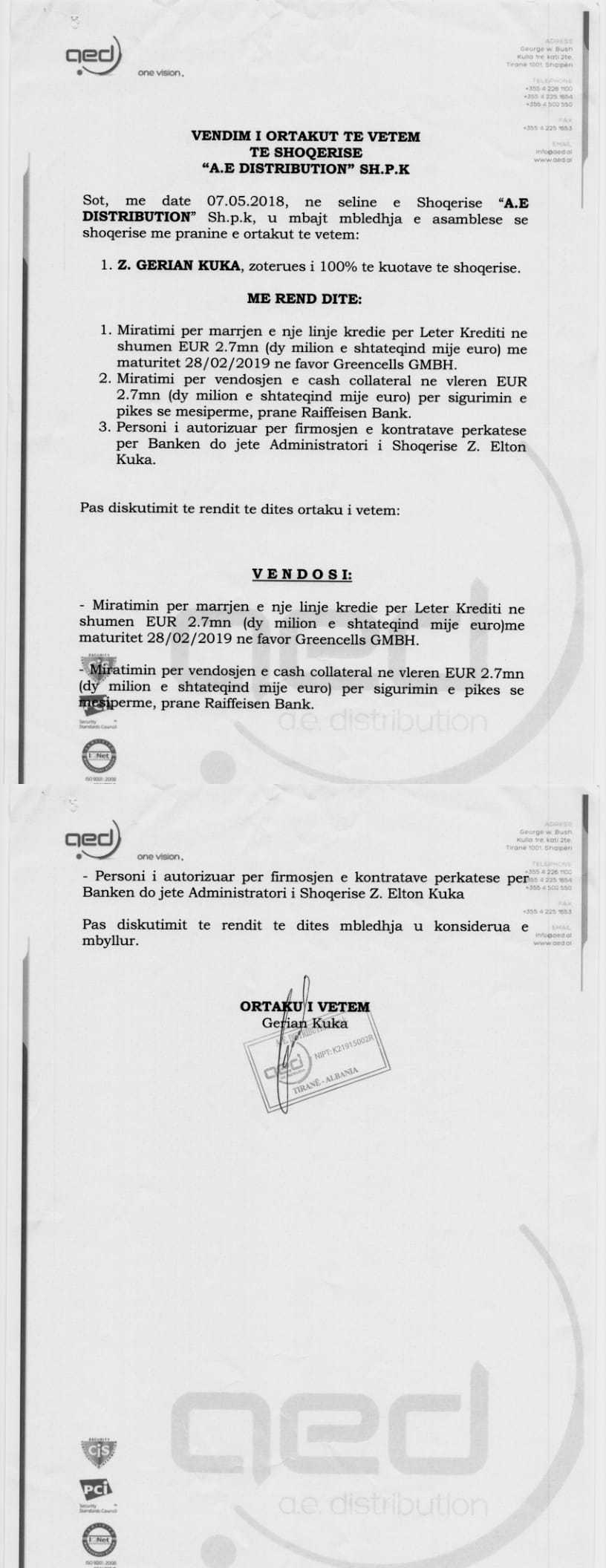 Më datë 23.04.2018, u lidh Marrëveshjes Siguruese Mbi Kuotat e Pjesëmarrjes në Shoqëri Nr.1946 Rep., Nr. 848Kol., ndërmet Raiffeisen Bank sh.a dhe barrëdhënësve: Gerian Kuka, Rovena Kuka, “A.E. DISTRIBUTION” sh.p.k dhe “Albanian General Electricity” sh.a.