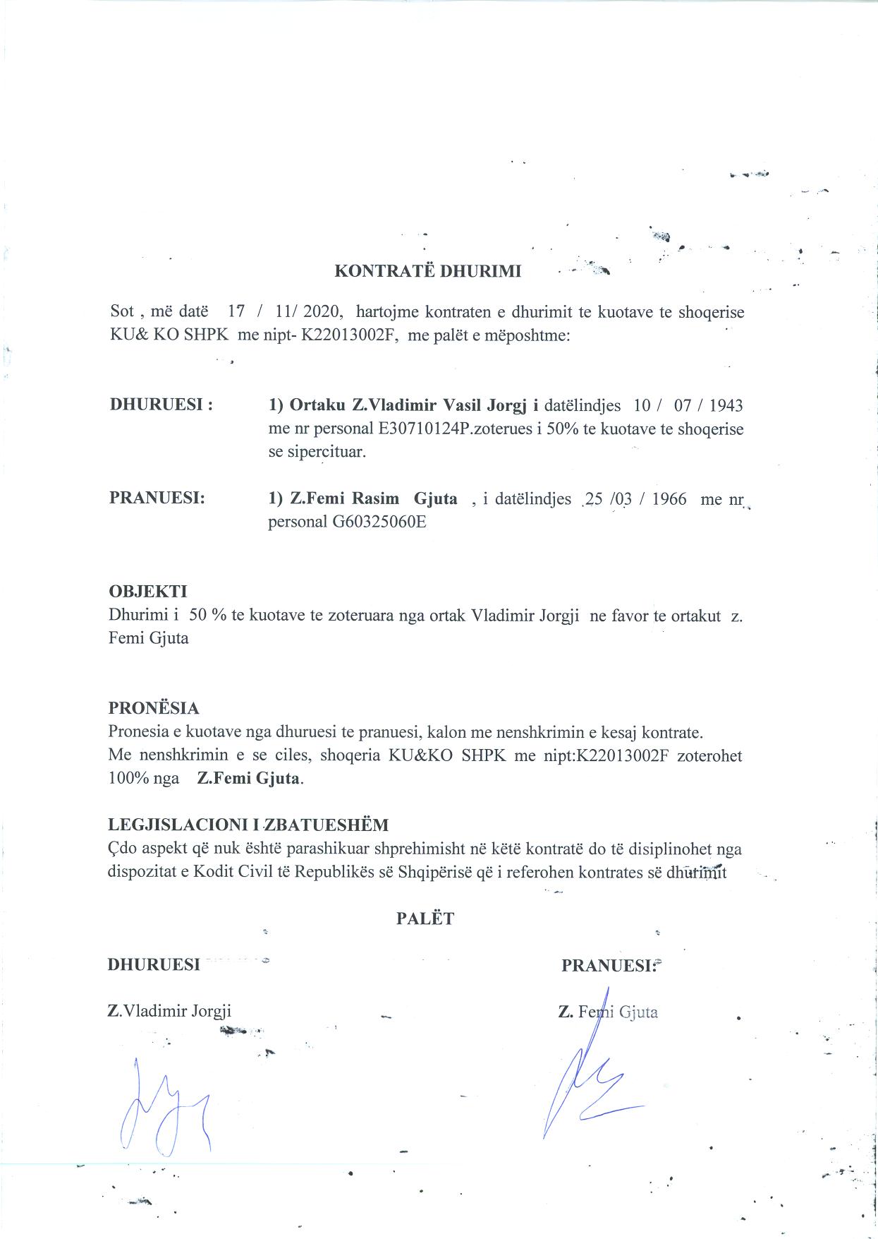 → Ekstrakti Historik i Regjistrit Tregtar date 04.11.2021 → Vendim i Asamblese se Pergjithshme per rritjen e kapitalit date27.06.2016 → Kontrate e Dhurimit te Kuotave date 17.11.2020 |
