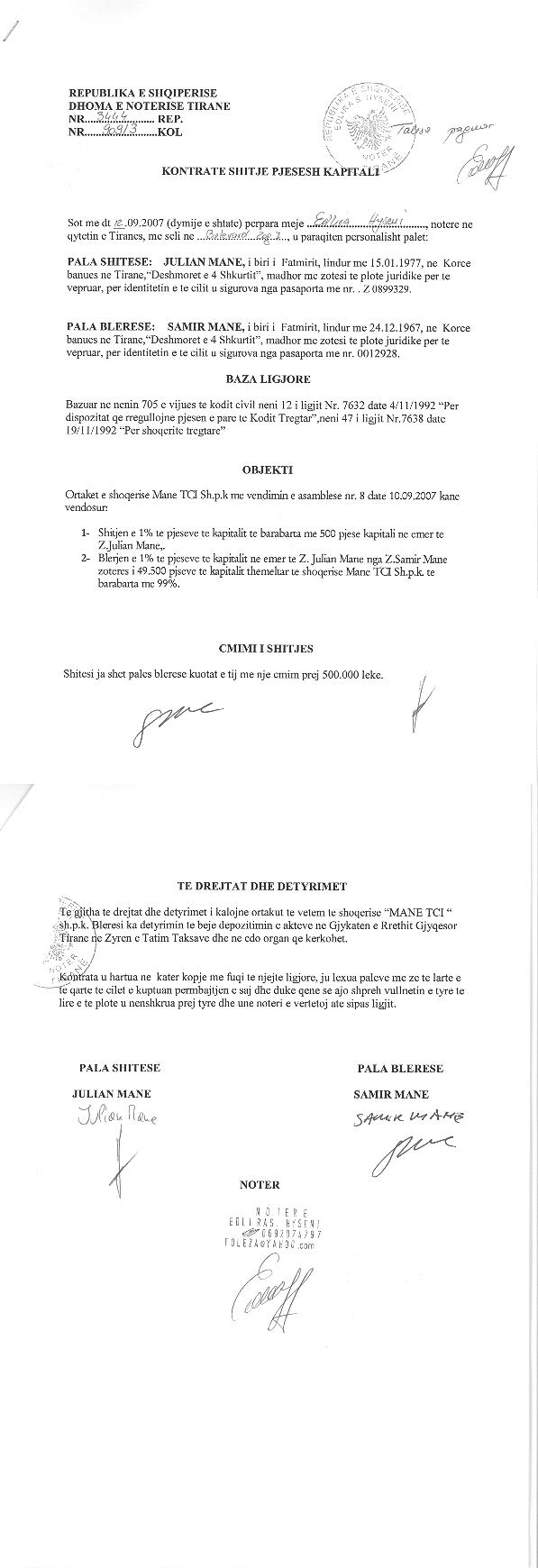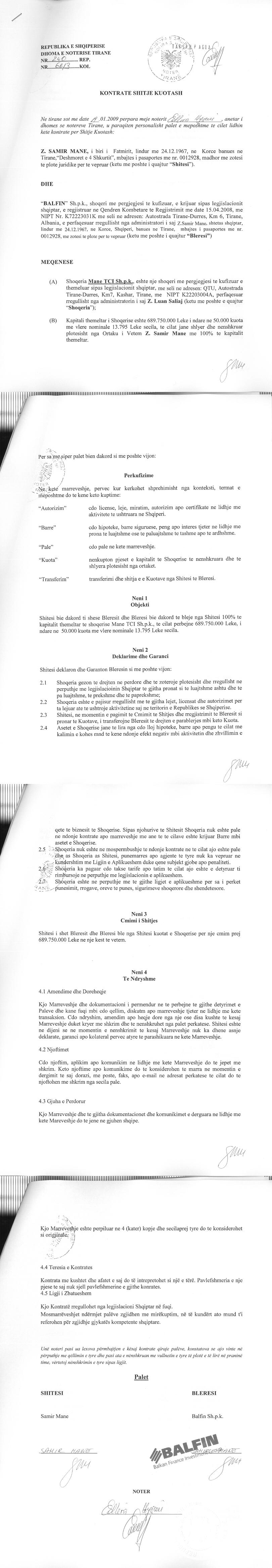 | Shoqëri Mëmë / Zotërues për këtë Subjekt: | “Balfin - Balkan Finance Investment Group”, shoqëri me përgjegjësi te kufizuar e se drejtës shqiptare, e themeluar me datë 11/09/2007, me NIPT K72223031K, me seli qendrore ne Tirane, Njesia bashkiake nr.2, Rruga Papa Gjon Pali II, Ndertesa Nr.12, Kati 11, Zyra nr.1206, Kodi Postar 1010, dhe me administrator Edlira Muka. Ortak i Vetëm i shoqërisë është Samir Mane. (Sipas të dhënave të QKB deri me datë 19.10.2023) Sipas Ekstraktit Historik te Regjistrit te Pronarit Perfitues, date 13.04.2021, terhequr nga QKB date 19.10.2023, Pronar perfitues te subjektit “MANE TCI”, zoterues te 25% te kapitalit e me teper eshte: Samir Mane, shtetas shqiptar, i datelindjes 1967, pronar perfitues prej 100% te kapitalit, pasi zotëron 100% të kapitali të shoqërisë “Balfin - Balkan Finance Investment Group”, e cila zotëron 100% të kapitalit të “MANE TCI”. Data e percaktimit si pronar perfitues eshte 07.08.2001. |