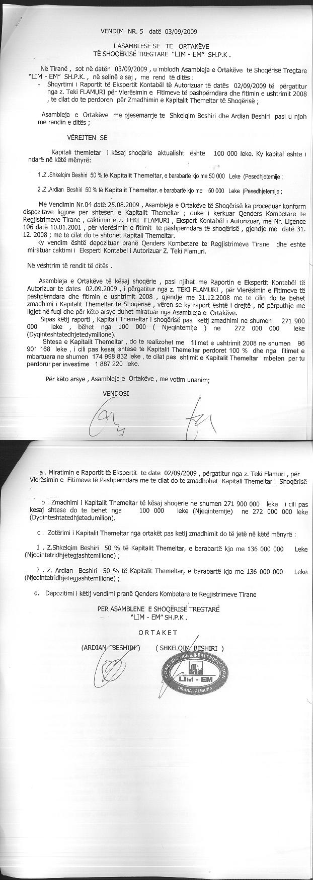 | Shënime: | Adresa Dytësore (NIPT-e) të Përfunduar ndër vite: I. Durres, Objekt ne ndertim (ish rajoni i Policise), Lagjja numer 6, Rruga Maliq Muço, Durres II. Tirane, Farke, Komuna Farke, prane kopshtit Zoologjik - Sauk III. Tirane, Rruga Budi tek Kryqz. me Q. Guranjak IV. Tirane, Rruga Durrësit, Ish Uzina Tirana, Objekt në Ndërtim V. Durres, Rruga Tualantia, Vollgë, Durrës VI. Tirane, Rruga Papa Kristo Negovani, Objekt ne ndertim VII. Tirane, Berxull, Lagjje e Re, Rruga Tirane-Durres, Ndertim i magazines frigoriferike 4 kateshe, zona kadastrale 1514, objekt ne ndertim VIII. Tirane, Njesia Bashkiake nr.2, Rruga Tefta Tashko Koço, zona kadastrale 8150, Godine banimi dhe sherbimi 7 dhe 9 kate, objekti ne ndertim IX. Tirane, Njësia Bashkiake nr.11, Rruga" Gjergj Legisi", Objekt në ndërtim, zonë kadastrale nr.8310, numër pasurie 9/176 X. Tirane, Vaqarr, Prush, Rruga dytesore Prush, Kapanon me Nr.Pasurie 151/54, ZK.3064 XI. Durres, Rrashbull, Arapaj, Ura e Rrogozhines pika 235, Degezim ne kavaje deri ne Arapaj, Aksi i Rruges Kryesore Kavaje- Njesia Administrative Rrashbull, objekt ne ndertim XII. Tiranë, Zall Herr, Njesia Administrative Zall Herr, Ambjenti me Nr.pasurie 92/44, zona kadastrale 3878, vol.8, faqe 59 XIII. Kavaje, Qerret; Nr. pasurie 1/81 Zona Kadastrale Nr. 3101. Kompetencat e Administratorit: Vetem ortaket e shoqerise te dy sebashku Z. Shkelqim Beshiri dhe Z. Ardian Beshiri kane te drejta per te administruar dhe mbarevajtur te gjitha pasurite e lujtshme dhe te paluajtshme qe kjo shoqeri zoteron ne emrin e saj. Vetem ortaket e shoqerise te dy sebashku kane te drejta qe te nenshkruajne Kontrata tjetersimi, shitje, blerje, Kontrata Kredie, Kontrata Shitblerjes Automjetesh, Kontrata Qiradhënie dhe Qiramarrje, Kontrata Huaperdorimi, Kontrata Shërbimi, Kontrata Sipermarrje, Kontrata per caktim pjesesh takuese ne nje sipermarrje, Shkembimi, Deklarata, Akt Marreveshje, Kontrata Porosie, Kontrata per prenotim Apartamenti, Kontrata Nenkontraktimi, Kontrata Furnizimi, dhe cdo akt tjeter noterial ose jo noteriale, pa u kufizuar ne llojshmeri kontrate apo Akt Marreveshje per te gjitha objektet ku shoqeria “LIM-EM“ shpk eshte ndertuese/zhvilluese kontraktore apo nenkontraktore. Vetem ortaket e shoqerise te dy sebashku kane te drejte te paraqiten pranë te gjitha bankave te Nivelit te Dyte, te hapin, te mbyllin llogari bankare, te kryejne pagesa, transaksione, terheqje depozitim. Keto te drejta mund te delegohen me nenshkrimin e te dyve ne pale te treta. Aktet qe nuk nenshkruhet nga te dy ortaket sebashku konsiedrohen te pavlefshme. Administratori nuk ka te drejte nenshkrimi. |