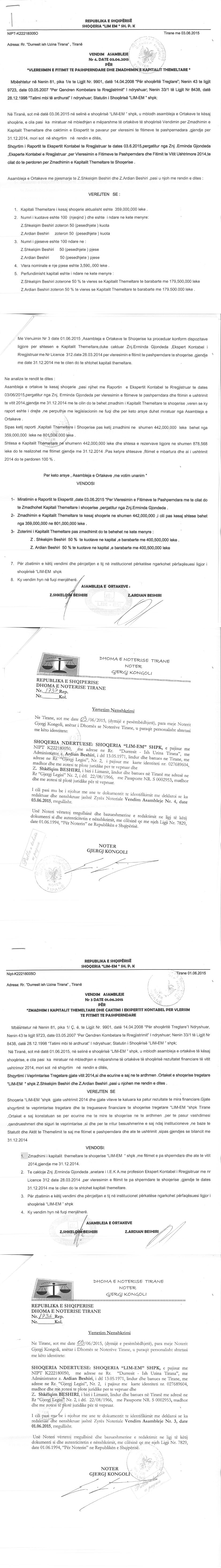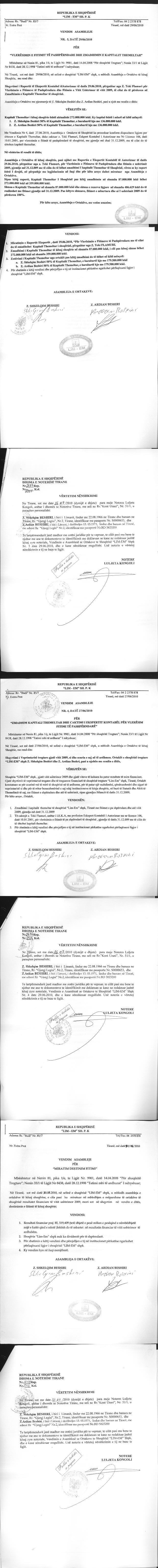 → Ekstrakt Historik i Regjistrit Tregtar date 10.07.2024 → Akt themelimi dhe Statuti i Shoqërisë → Dokumente të Ndryshme → Kontratë Shit-Blerje datë 09.07.2002 → Vendim i Asamblesë së Ortakëve, Zmadhim Kapitali datë 03.09.2009 → Vendim i Asamblesë së Ortakëve, Zmadhim Kapitali datë 29.06.2010 → Vendim i Asamblesë së Ortakëve, Zmadhim Kapitali datë 03.06.2015 → Vendim i Asamblesë së Ortakëve, Zmadhim Kapitali datë 17.08.2016 → Kontratë Dhurimi Pasuri e Luajtshme datë 19.10.2016 → Kontratë Dhurimi Pasuri e Luajtshme datë 21.04.2017 → Vendim i Asamblesë së Ortakëve, Zmadhim Kapitali datë 16.06.2018 → Vendim i Asamblesë së Ortakëve, Zmadhim Kapitali datë 21.07.2023 → Urdhër për Vënien e Sekuestros datë 29.07.2019 → Urdhër për Pushimin e Ekzekutimit datë 23.09.2019 → Urdhër për Vënien e Sekuestros datë 21.10.2019 → Urdhër për Heqjen e Sekuestros datë 30.10.2019 → Ekstrakt Historik i Regjistrit Tregtar date 11.12.2024 → Urdher Per heqjen e sekuestros date 11.11.2024 |