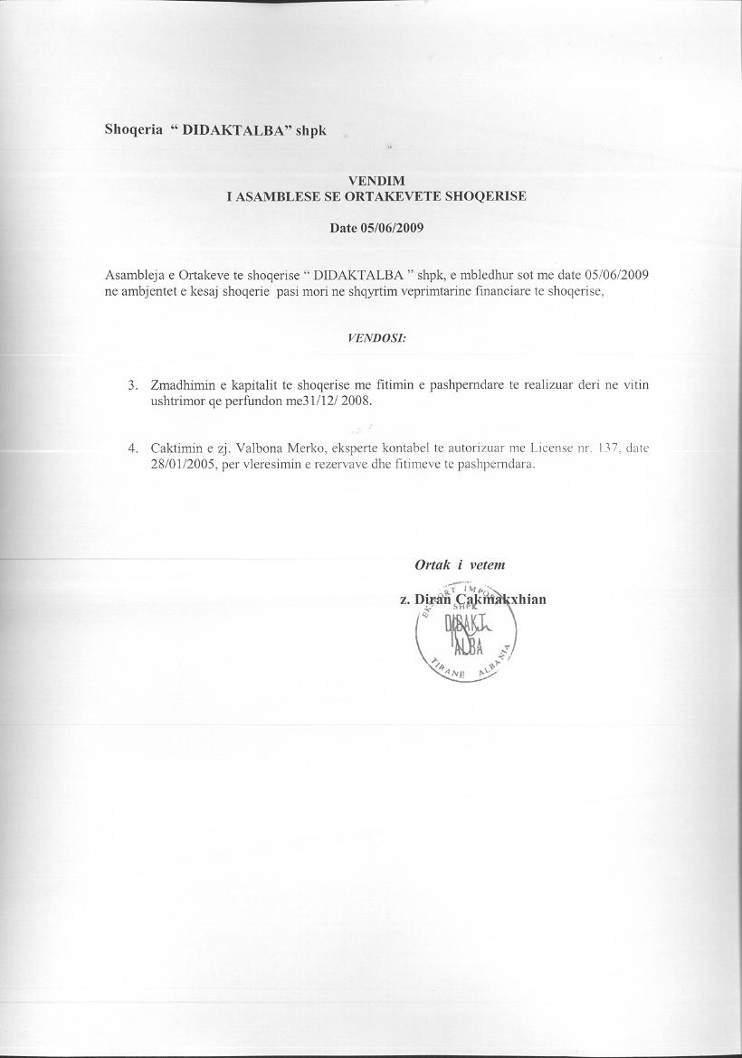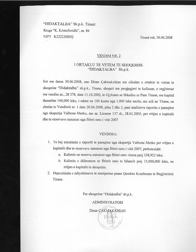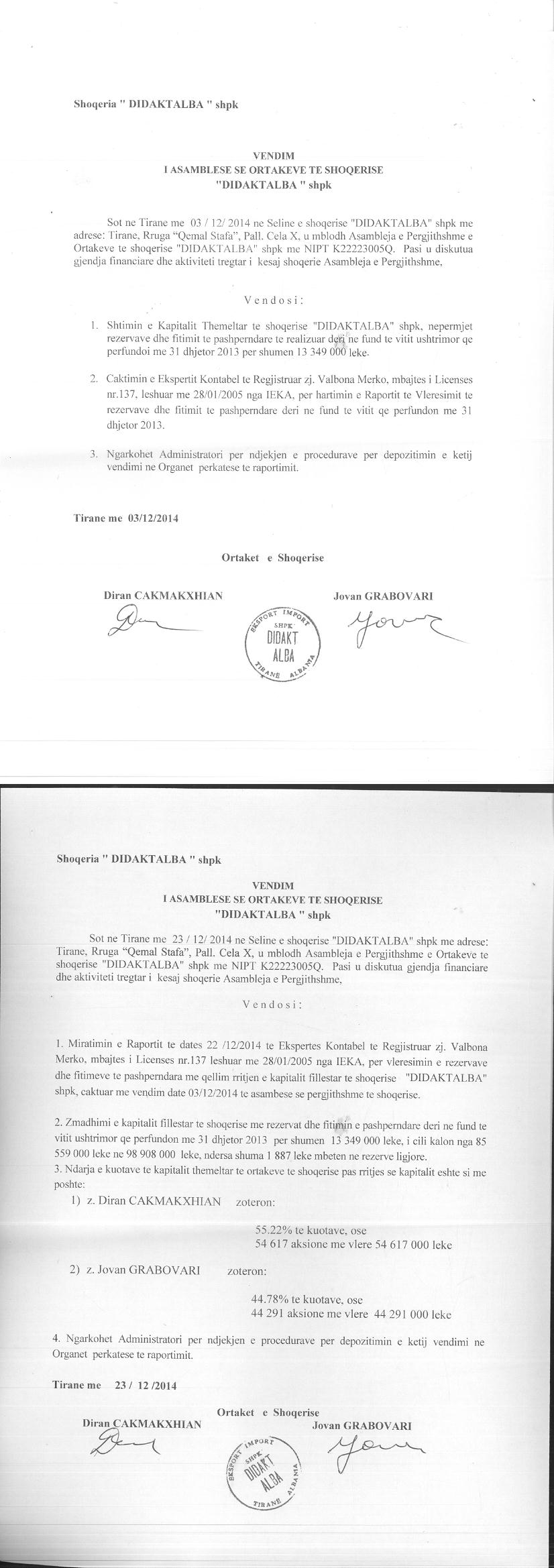 → Ekstrakt Historik i Regjistrit Tregtar date 31.05.2023 → Akt themelimi dhe Statuti i Shoqerise → Vendim i Ortaku të Vetëm, Zmadhim Kapitali datë 23.06.2005 → Vendim i Ortakut të Vetëm, Zmadhim Kapitali datë 20.05.2006 → Vendim i Ortakut të Vetëm, Zmadhim Kapitali datë 30.06.2008 → Vendim i Asamblesë së Ortakëve, Zmadhim Kapitali datë 05.06.2009 → Vendim i Ortakut të Vetëm, Zmadhim Kapitali datë 20.06.2012 → Projekt për Bashkimin e Shoqërive "Didaktalba" shpk dhe "Laboral" shpk datë 28.12.2012 → Raport i Ekspertit Kontabël për Bashkimin e Shoqërive tregtare "Didaktalba" shpk dhe "Laboral" shpk → Vendim i Asamblesë së Ortakëve, Zmadhim Kapitali datë 03.12.2014 → Vendim i Asamblesë së Ortakëve, Zmadhim Kapitali datë 28.06.2016 → Dëshmi e trashëgimisë Ligjore datë 20.12.2016 → Kontratë Dhurimi Kuotash datë 28.10.2022 → Ekstrakt Historik i Regjistrit te Pronareve Perfitues date 31.05.2023 → Ekstrakt Historik i Regjistrit Tregtar date 14.09.2024 → Kontratë Dhurimi Kuotash datë 27.10.2023 → Kontratë Dhurimi Kuotash datë 18.12.2023 |