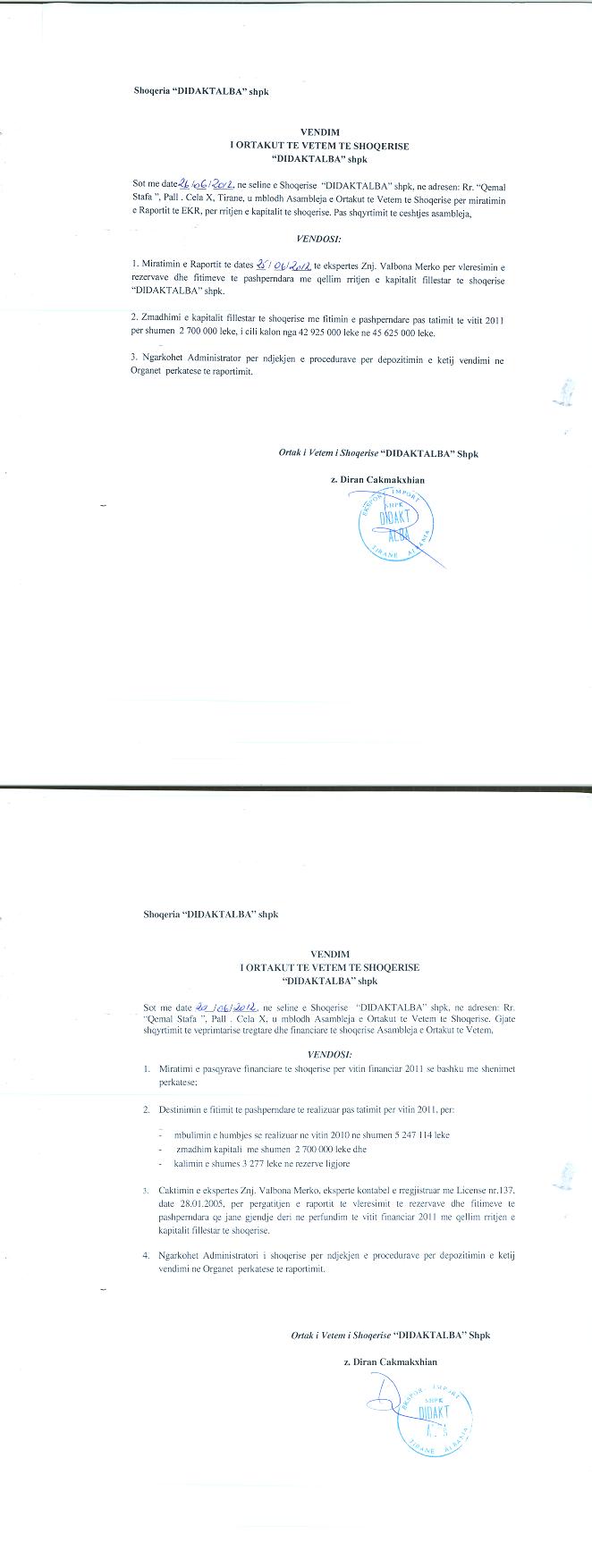 | Çështje Ligjore: | Bashkimi me Përthithje I. Me datë 28.11.2012, u nënshkrua projekti për bashkimin nëpërmjet përthithjes të shoqërive "Didaktalba" shpk (shoqëria përthithëse) dhe "Laboral" shpk (shoqëria e përthithur). II. Me datë 28.12.2012, u miratua raporti i ekspertit kontabël për bashkimin nëpërmjet përthithjes të shoqërisë "Laboral" shpk (shoqëria e përthithur) me shoqërinë "Didaktalba" shpk (shoqëria përthithëse). Pas bashkimit emri i shoqërisë përthithëse mbetet i njëjtë, ndërsa shoqëria e përthithur do pushoj së ekzistuari. Kapitali i shoqërisë bëhet 85.559.000 (tetëdhjetë e pesë milion e pesëqind e pesëdhjetë e nëntë mijë) lekë dhe ndryshon struktura e kapitalit. |