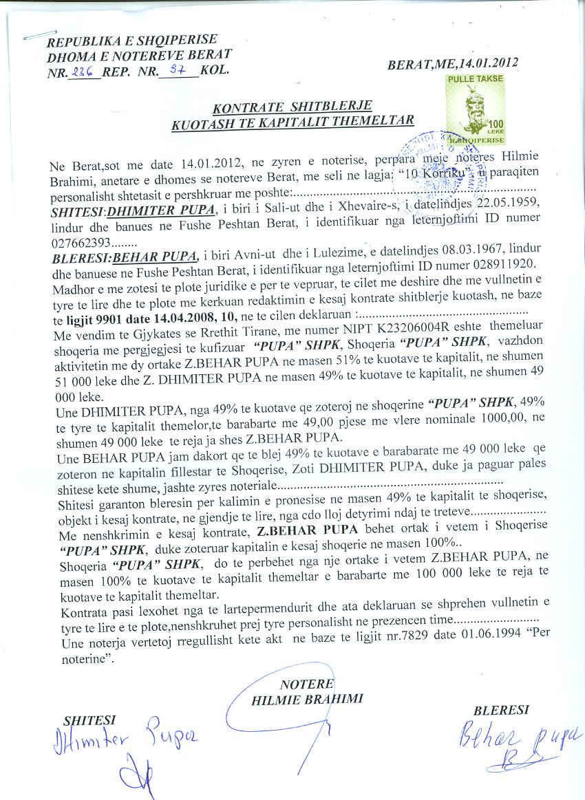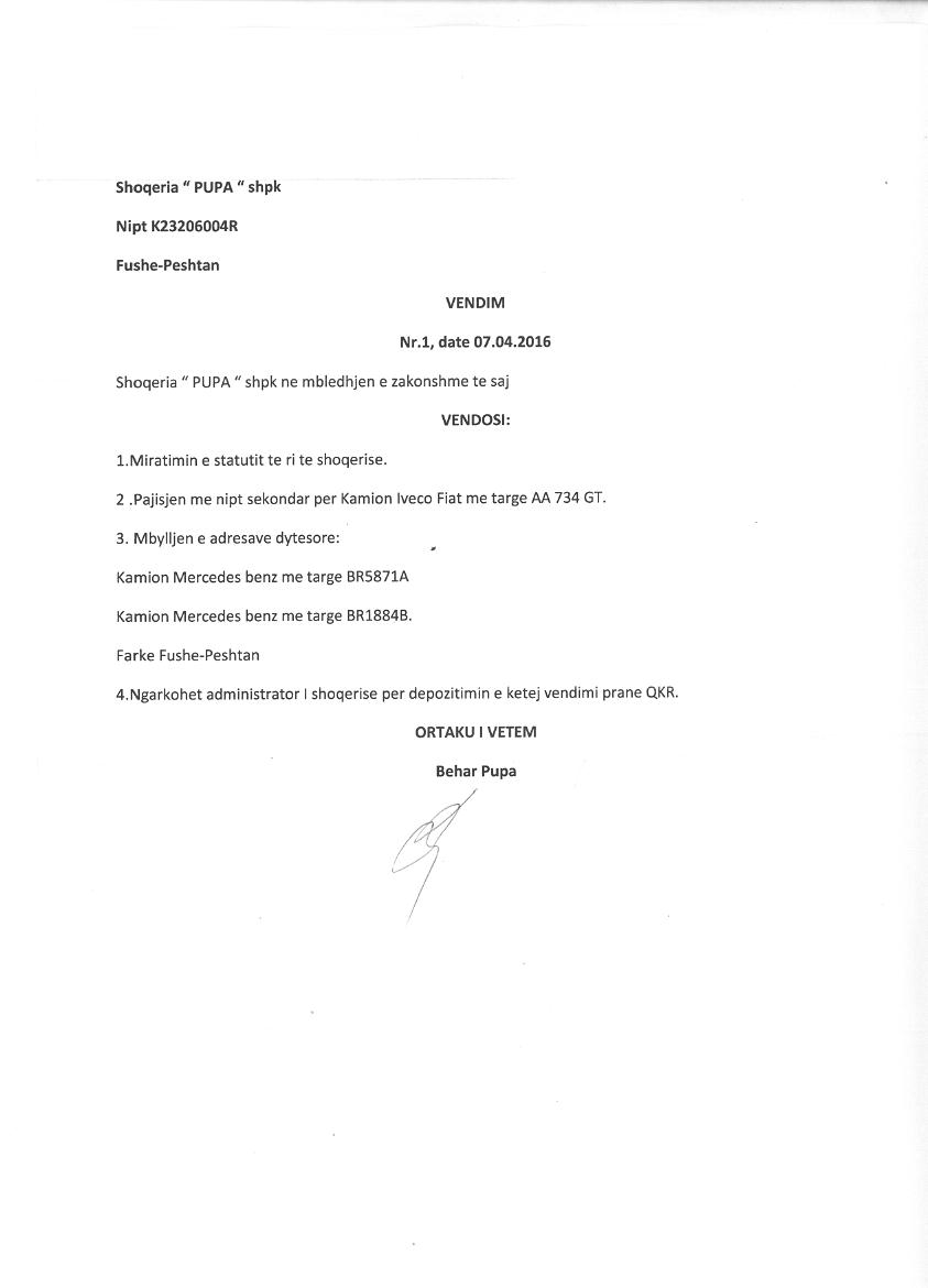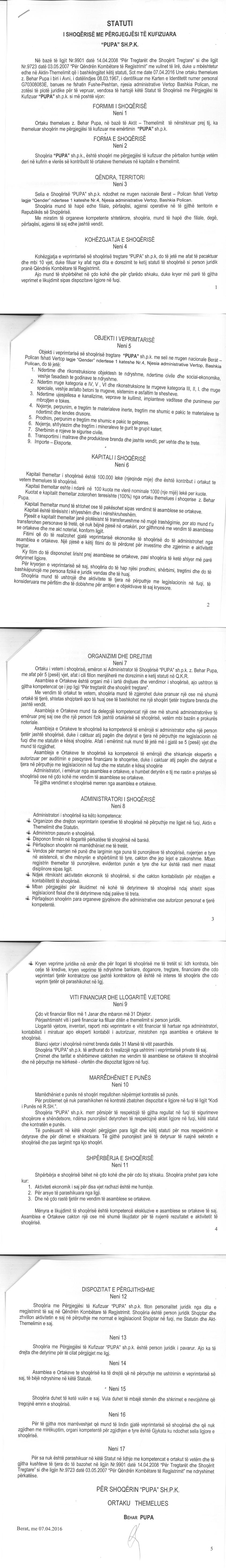 → Ekstrakt Historik i Regjistrit Tregtar, date 23.12.2021 → Dokumenta te ndryshme nder vite → Kontrate shitje kuotash, date 14.01.2012 → Statuti i shoqerise, date 07.04.2016 → Vendimi i asamblese date 07.04.2016 |
