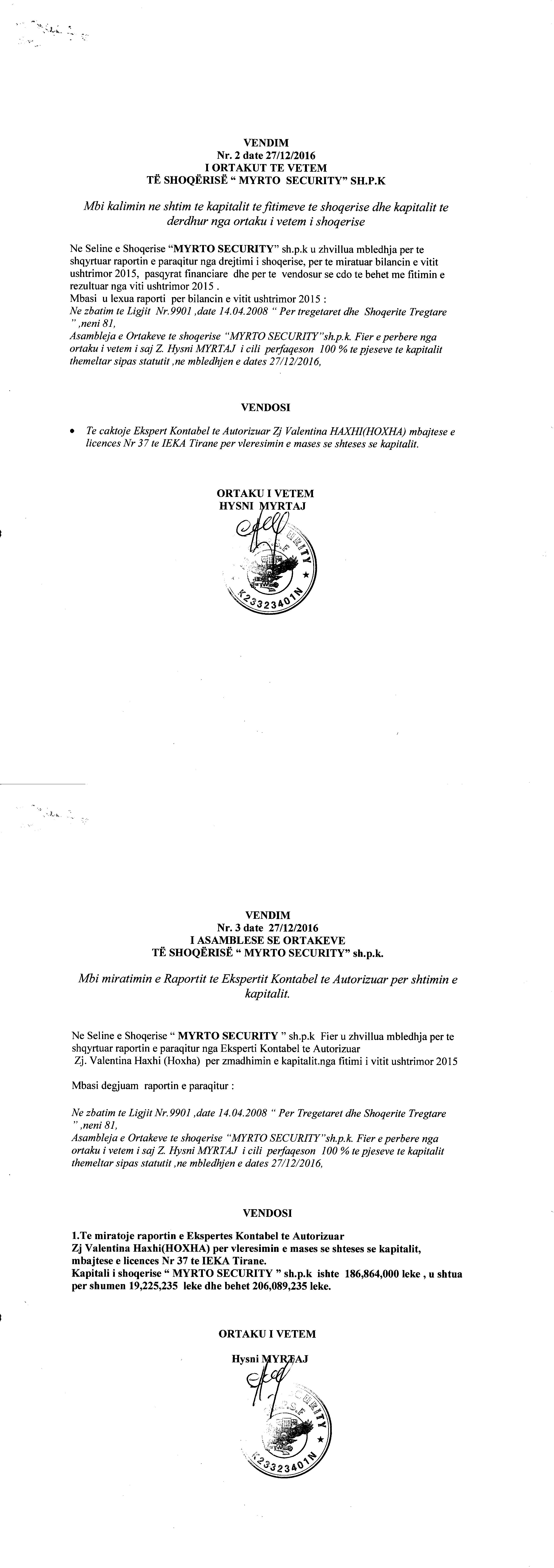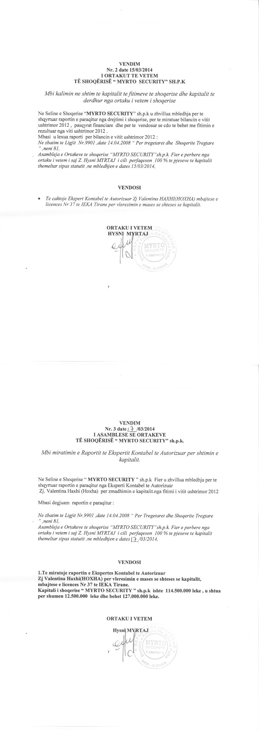 | Çështje Ligjore: | Me date 12.06.2015, u hartua akt marreveshja e bashkimit me perthithje te shoqerise “Myrto” (shoqeria e perthithur) me NIPT K33003404V me shoqerine “Myrto Security” sh.p.k (shoqeria perthithese), si pasoje prishjen pa likujdim te shoqerise Myrto shpk. Kapitali i shoqerise do te jete i barabarte me shumen e kapitaleve te vete te dy shoqerise. Kapitali i shoqerise Myrto Security eshte 175.774.765 (njeqind e shtatedhjete e pese milion e shtateqind e shtatedhjete e kater mije e shtateqind e gjashtedhjete e pese) leke. Kapitali i shoqerise Myrto shpk eshte 11.089.660 (njembedhjete milion e tetedhjete e nente mije e gjashteqind e gjashtedhjete) leke. Kapitali i shoqerise pas bashkimit do te jete 186.864.000 (njeqind e tetedhjete e kater milion e teteqind e gjashtedhjete e kater mije) leke dhe vlera 425 leke do te jete rezerve ligjore. Ortak i vetem i shoqerise do te jete Hysni Myrtaj. |