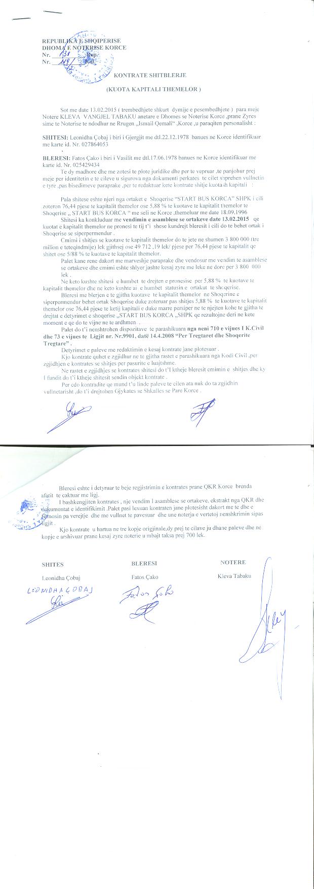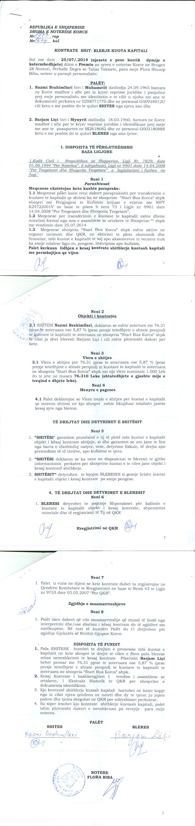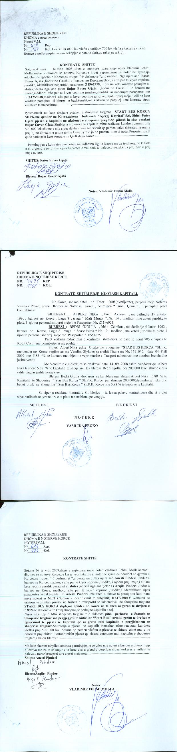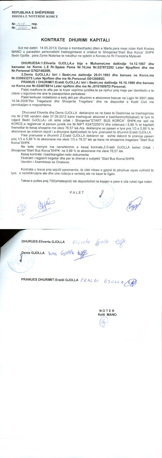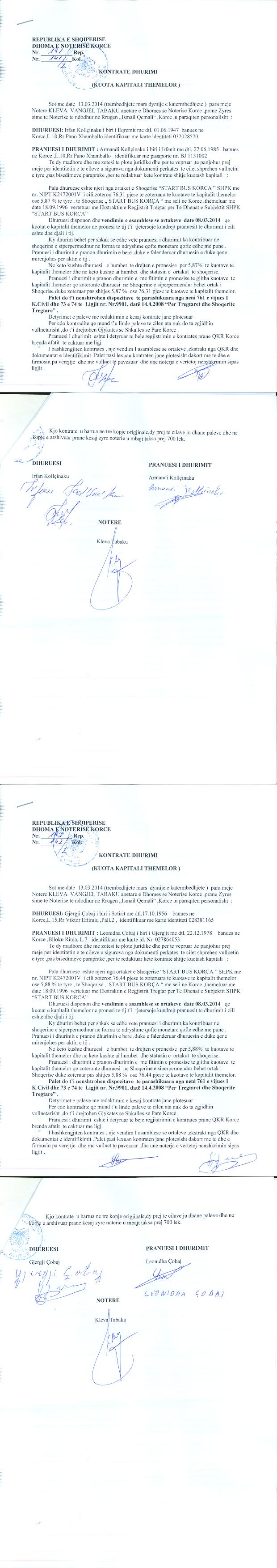 → Ekstrakt historik i regjistrit tregtar date 29.01.2022 → Akti i themelimit dhe statuti → Vendim i Gjykates se Rrethit Gjyqesor Korce per leshimin e aktit te trashegimise, date 07.09.2012 → Kontrate shitje dhe pjestim vullnetar kuotash date 10.12.2003 → Kontrate shit-blerje kuota kapitali date 04.07.2017 → Kontrate shitje date 04.03.2008 → Kontrate shitblerje date 26.01.2012 → Kontrate dhurim kapitali date 14.05.2013 → Kontrate dhurimi date 13.03.2014 → Kontrate shit-blerje kuotash date 25.07.2014 → Kontrate shitje date 29.08.2014 → Kontrate shitblerje date 13.02.2015 → Kontrate shitblerje 30.07.2015 → Kontrate shitje date 22.12.2015 → Kontrate shit-blerje 04.07.2018 → Kontrate dhurimi date 18.09.2018 → Kontrate dhurimi kuotash date 12.02.2019 → Kontrate shitje kuotash date 31.12.2020 → Kontrate dhurimi kuotash date 04.02.2021 → Kontrate shitblerje kuotash 02.06.2008 → Kontrate dhurimi date 14.05.2013 |