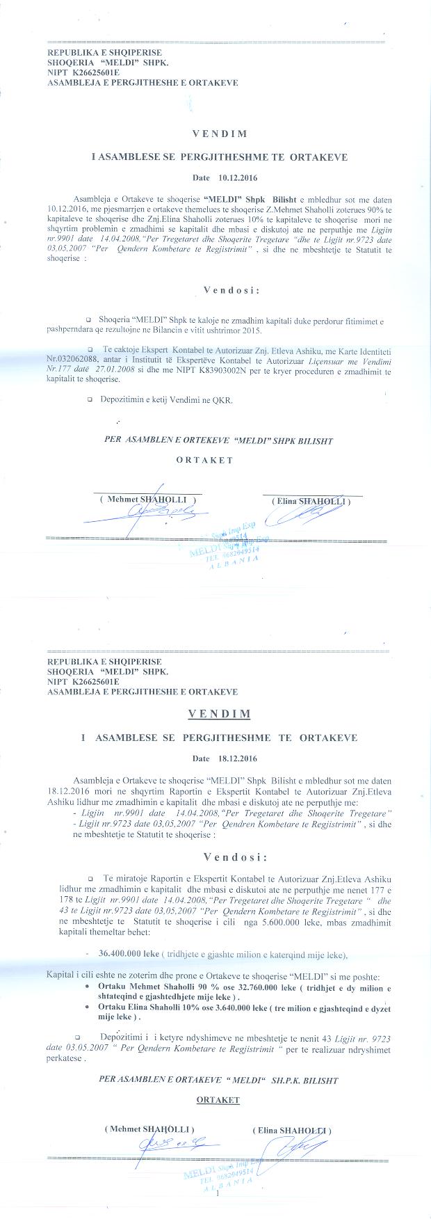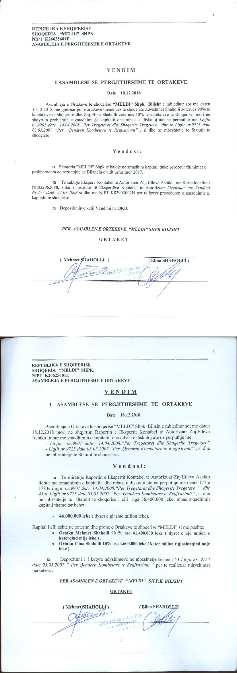 → Ekstrakt historik i regjistrit tregtar 27.08.2021 → Akti I themelimit → Vendimi i asamblese per zmadhimin e kapitalit 10.12.2016 → Vendimi i asamblese per zmadhimin e kapitalit 10.12.2018 |