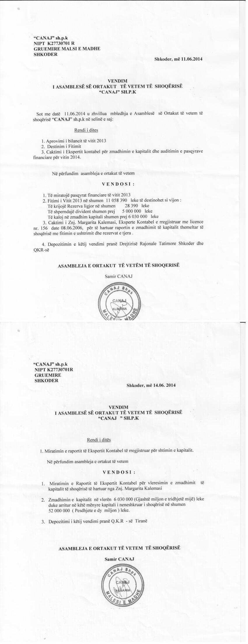 → Ekstrakt Historik i Regjistrit Tregtar date 05.10.2023 → Akt themelimi i Shoqerise → Kontratë Shitblerje Kuotash datë 11.03.2009 → Vendim i Ortakut të Vetëm, Zmadhim Kapitali datë 21.06.2010 → Vendim i Ortakut të Vetëm, Zmadhim Kapitali datë 20.06.2012 → Vendim i Ortakut të Vetëm, Zmadhim Kapitali datë 20.06.2013 → Vendim i Ortakut të Vetëm, Zmadhim Kapitali datë 11.06.2014 → Vendim i Ortakut të Vetëm, Zmadhim Kapitali datë 27.04.2015 → Vendim i Ortakut të Vetëm, Zmadhim Kapitali datë 20.06.2016 → Vendim i Ortakut të Vetëm, Zmadhim Kapitali datë 18.06.2018 → Ekstrakt Historik i Regjistrit Tregtar date 16.04.2024 → Të dhënat e Investimit, Financimet Nga IPARD - Aksesuar nga Agjencia për Zhvillim Bujqësor dhe Rural AZHBR datë 17.04.2024 |