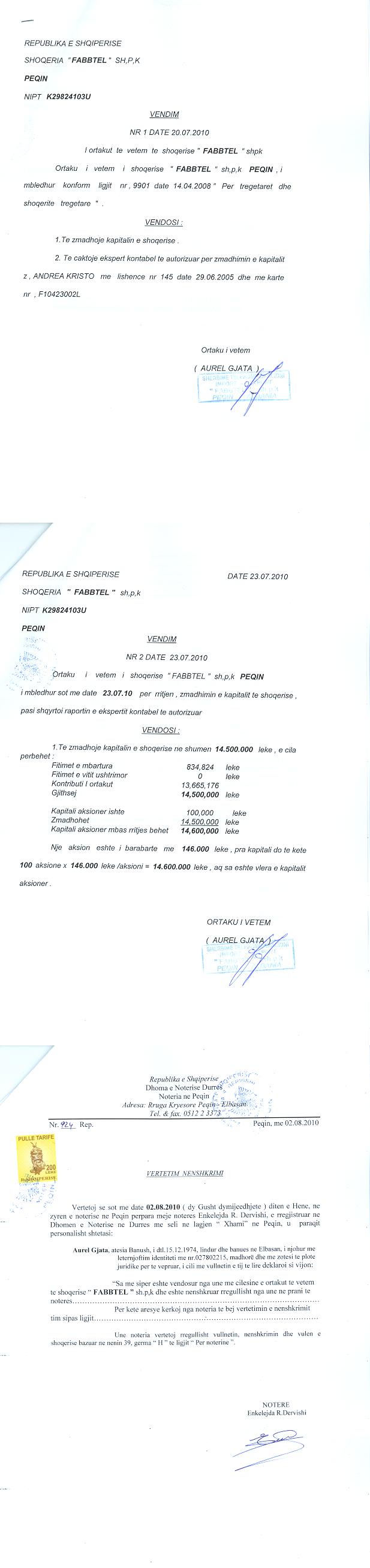 → Ekstrakti Historik i Regjistrit Tregtar date 14.01.2023 → Akt themelimi dhe Statuti i Shoqerise → Vendim i Ortakut te Vetem, Zmadhim Kapitali date 23.07.2010 → Kontrate Shitblerje Kuotash date 15.07.2016 → Deshmia e Trashegimise Ligjore date 17.06.2021 → Urdher per Venie Sekuestro date 06.07.2022 → Urdher per Heqje Sekuestro date 13.07.2022 → Kontrate shitje kuotash kapitali date 12/10/2022 |