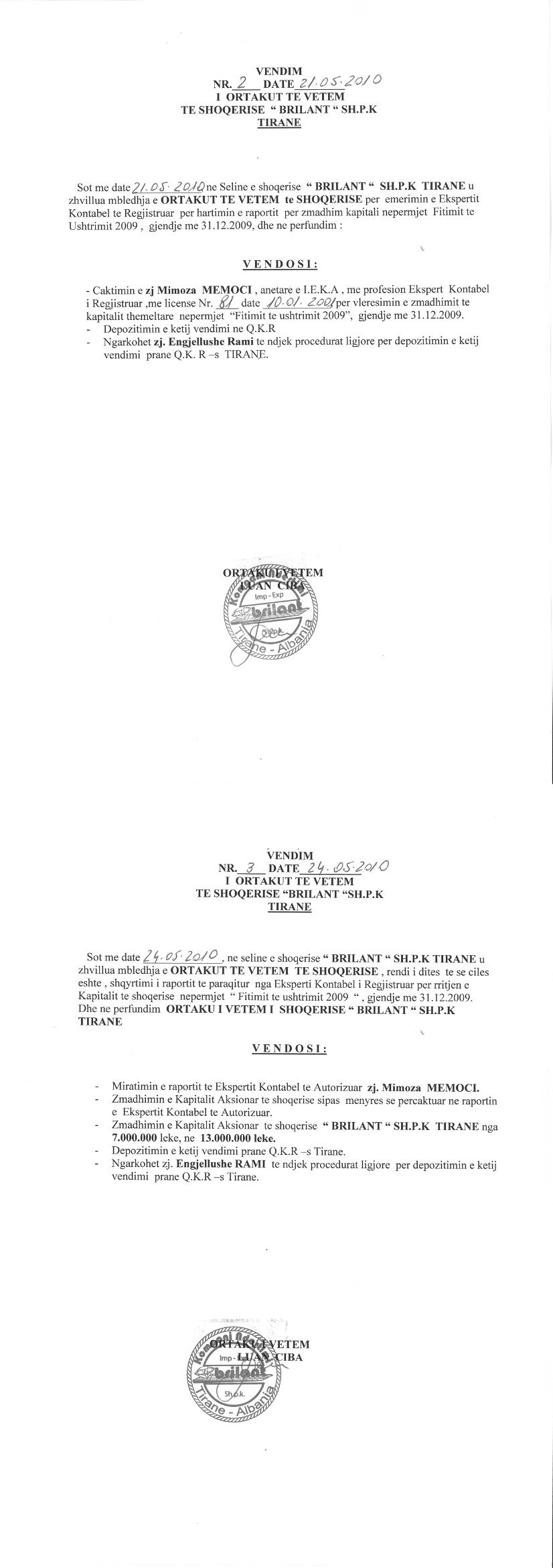 → Ekstrakti Historik i Regjistrit Tregtar date 17.03.2023 → Akt themelimi dhe Statuti i Shoqerise → Vendim i Ortakut te Vetem, Zmadhim Kapitali date 07.09.2005 → Vendim i Ortakut te Vetem, Zmadhim Kapitali date 24.05.2010 → Vendim i Ortakut te Vetem, Zmadhim Kapitali date 11.08.2012 → Vendim i Ortakut te Vetem, Zmadhim Kapitali date 11.07.2017 |