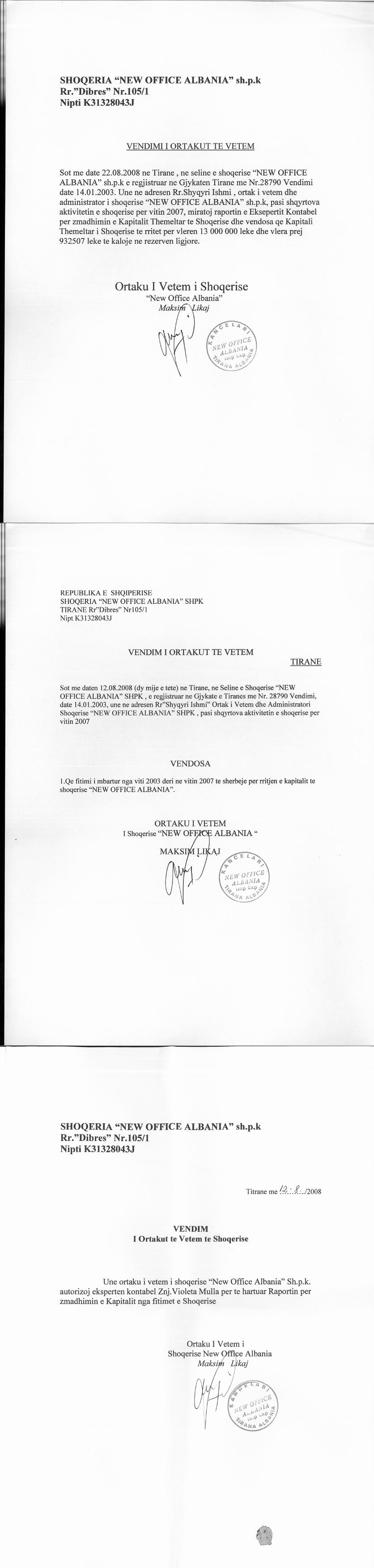 → Ekstrakt Historik i Regjistrit Tregtar, date 24.11.2021 → Kontrate shitje kuotash, date 5.10.2016 → Vendimi i Asamblese se ortakeve, date 22.08.2008 → Vendimi i Asamblese se Ortakeve, date 23.10.2018 |