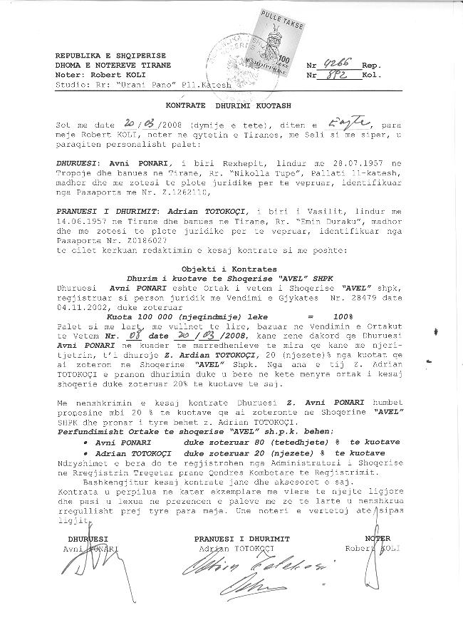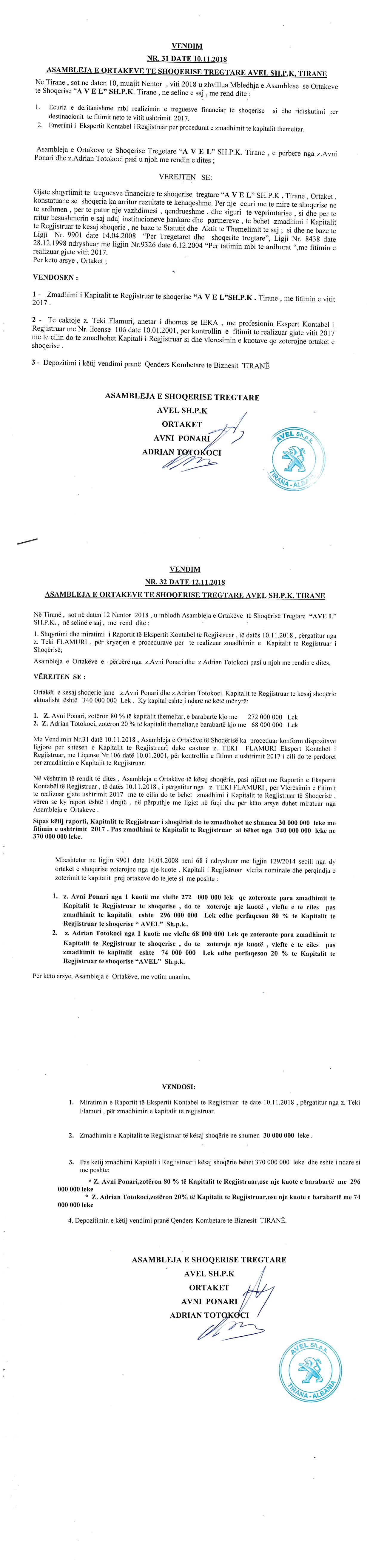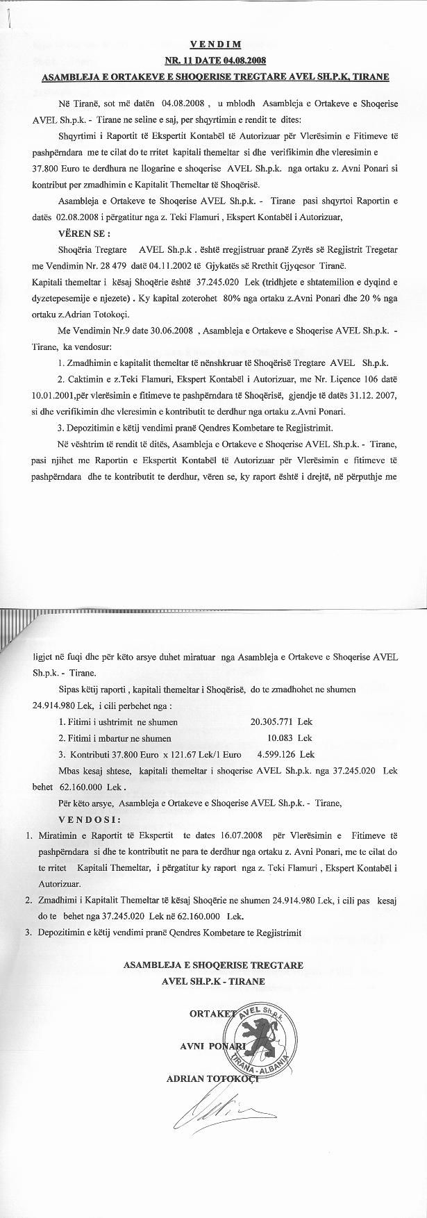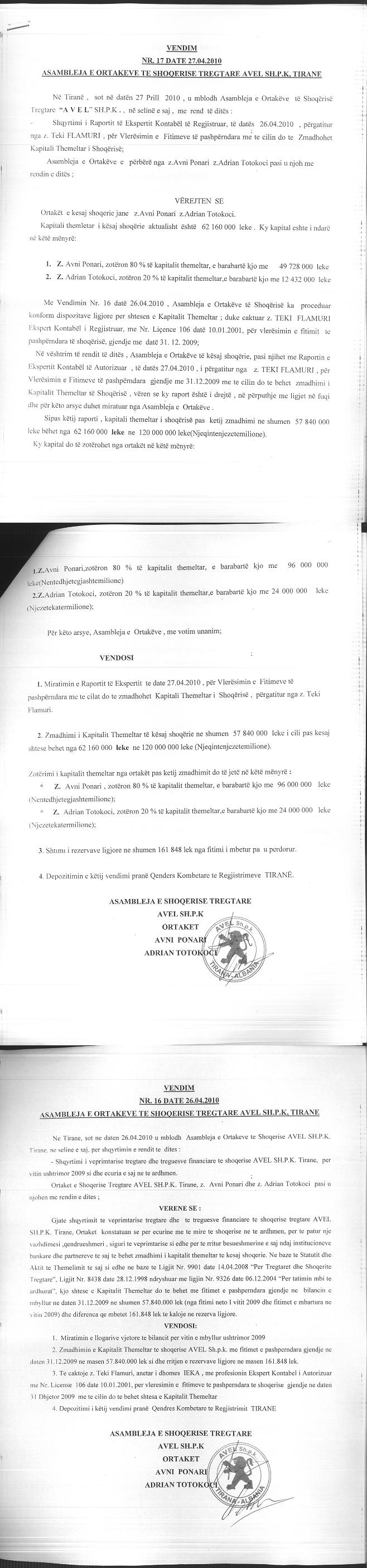 → Ekstrakti Historik i Regjistrit Tregtar date 17.03.2023 → Akt themelimi dhe Statuti i Shoqerise → Kontrate Dhurimi Kuotash date 12.04.2006 → Vendim i Ortakut te Vetem, Zmadhim Kapitali date 06.08.2007 → Kontrate Dhurimi Kuotash date 20.03.2008 → Vendim i Asamblese se Ortakeve, Zmadhim Kapitali date 04.08.2008 → Vendim i Asamblese se Ortakeve, Zmadhim Kapitali date 27.04.2010 → Vendim i Asamblese se Ortakeve, Zmadhim Kapitali date 26.05.2011 → Vendim i Asamblese se Ortakeve, Zmadhim Kapitali date 04.05.2012 → Urdher per Venie Sekuestro date 18.10.2013 → Urdher per Heqje Sekuestro date 05.02.2014 → Vendim i Asamblese se Ortakeve, Zmadhim Kapitali date 23.07.2014 → Vendim i Asamblese se Ortakeve, Zmadhim Kapitali date 14.10.2015 → Vendim i Asamblese se Ortakeve, Zmadhim Kapitali date 28.07.2017 → Vendim i Asamblese se Ortakeve, Zmadhim Kapitali date 12.11.2018 → Vendim i Asamblese se Ortakeve, Zmadhim Kapitali date 26.09.2019 → Vendim i Asamblese se Ortakeve, Zmadhim Kapitali date 03.11.2020 → Vendim i Asamblese se Ortakeve, Zmadhim Kapitali date 17.11.2021 |