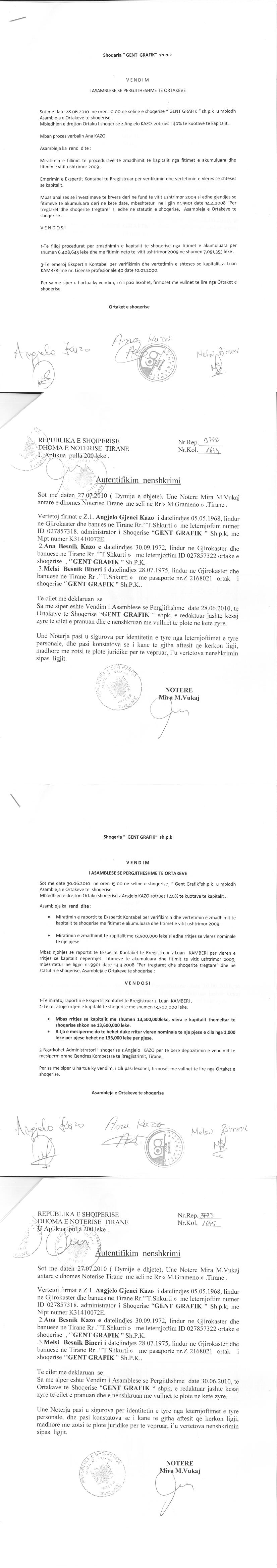 → Ekstrakti Historik i Regjistrit Tregtar date 07.03.2023 → Akt themelimi dhe Statuti i Shoqerise → Kontrate Shitje Kuotash date 13.02.2003 → Vendim i Asamblese se Ortakeve, Zmadhim Kapitali date 30.06.2010 → Ekstrakt Historik i Regjistrit Tregtar date 12.12.2024 |