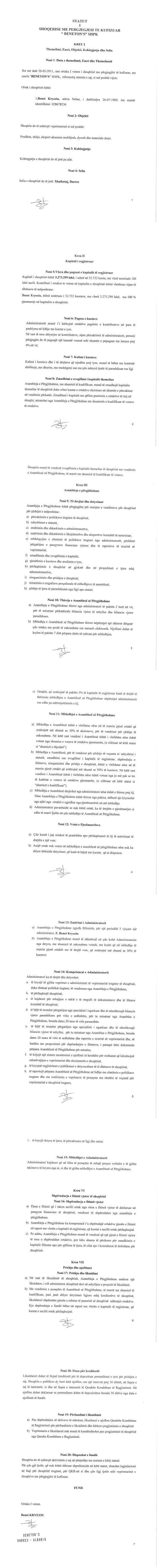 → Ekstrakti Historik i Regjistrit Tregtar date 21.06.2024 → Statuti fillestar i shoqerise dhe dokumenta te ndryshme → Statuti i perditesuar i shoqerise → Vendim i ortakut te vetem date 14.06.2010 → Vendimi i ortakut te vetem date 30.06.2011 → Vendimi i ortakut te vetem date 30.06.2014 → Vendimi i ortakut te vetem date 17.06.2015 → Raport Vleresimi date 08.10.2013 |
