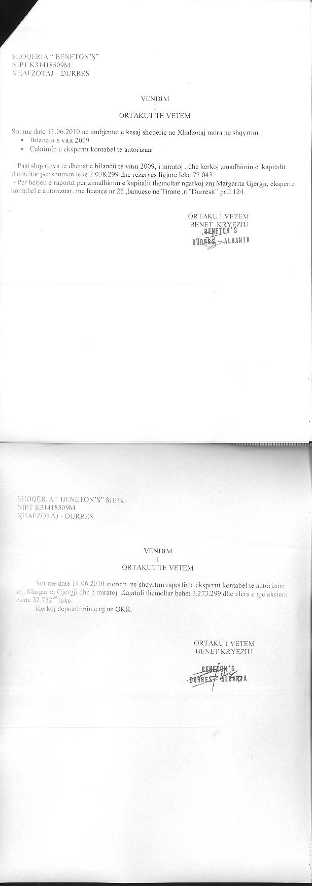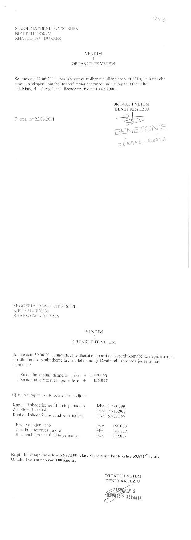 | Çështje Ligjore: | Me date 09.10.2013, me ane te vendimit te ortakut te vetem eshte miratuar raporti i vleresimit te Vleresuesit te Pasurise se Paluajtshme Ing. Lefter Shuka, date 02.10.2013. Ky vleresim behet per efekt te percaktimit te vleres se tregut te prones "Repart industrial", per efekt te pasqyrimit te vleres se ketij "Reparti industrial" ne asetet e shoqerise "BENETON'S". |