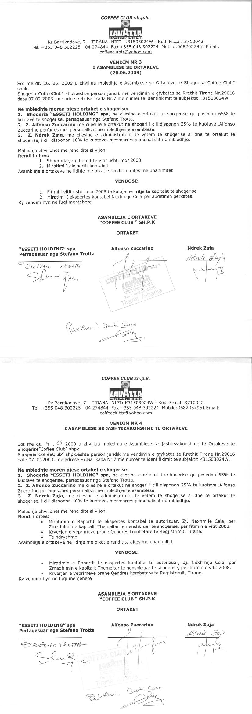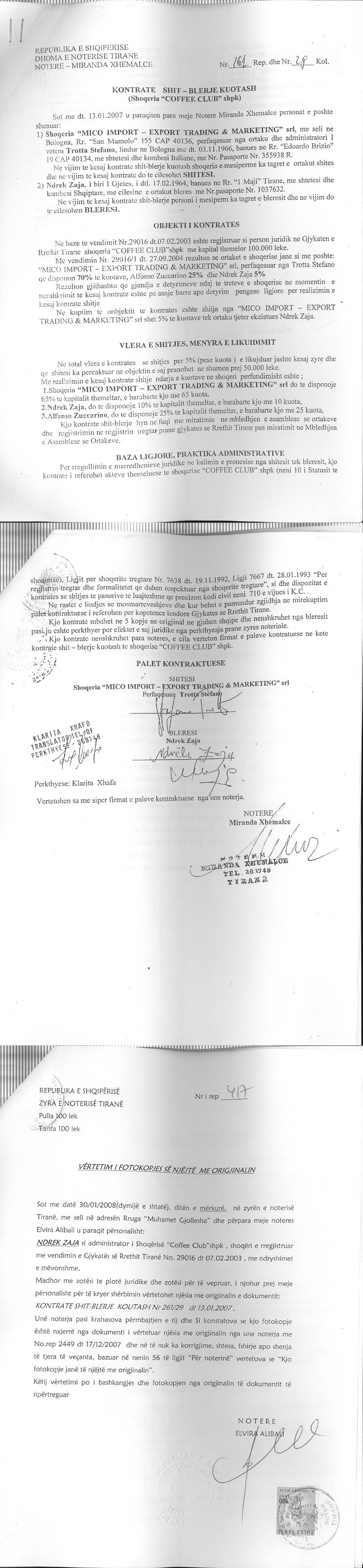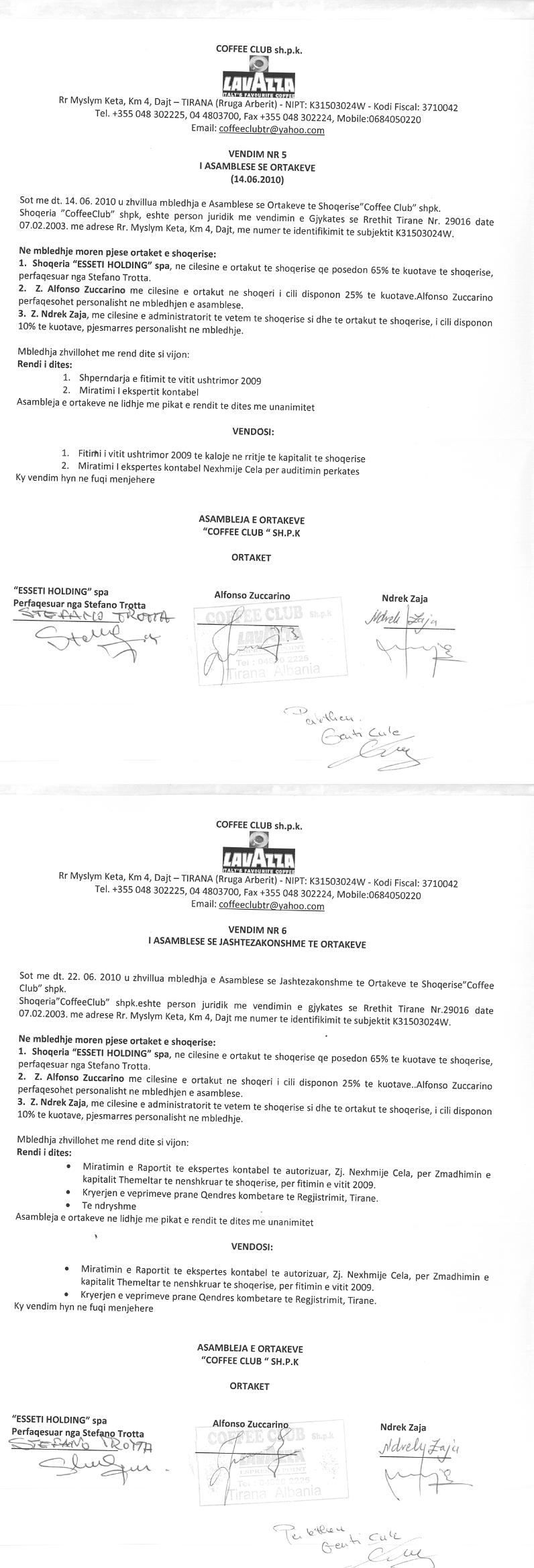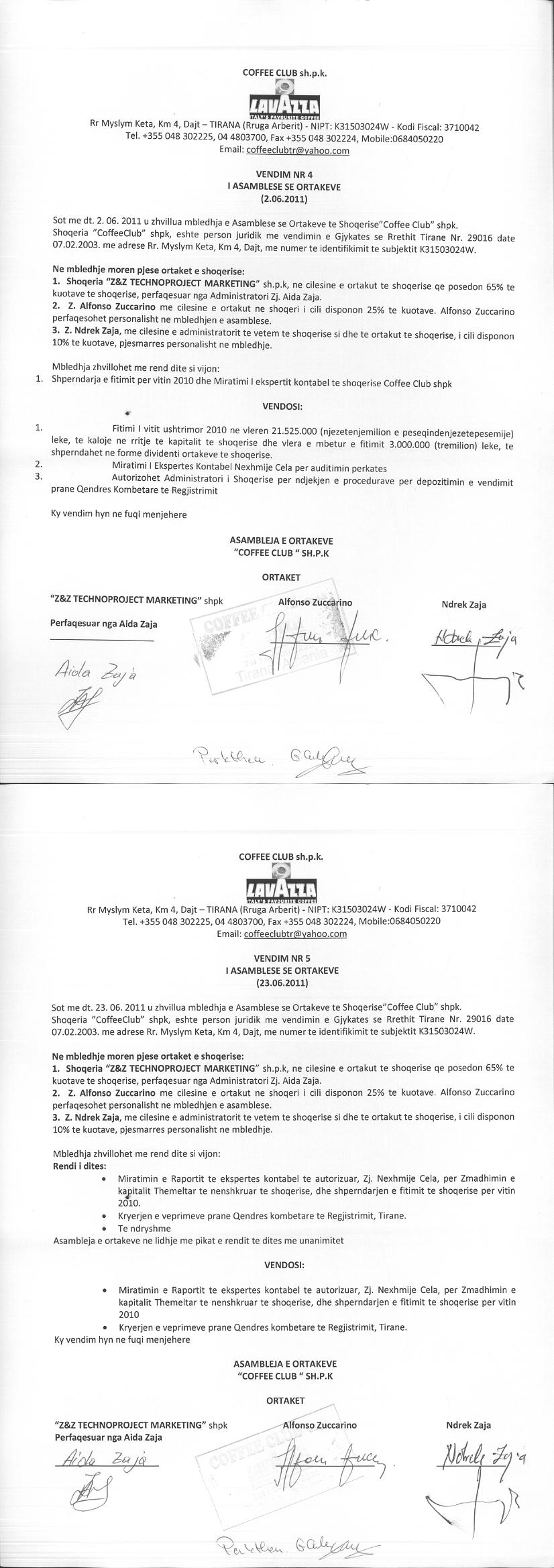 | Çështje Ligjore: | I. Me date 13/06/2013, me ane te Vendimit, date 05.06.2013, u vendos miratimi i marrjes se nje kredie Bankare ne vleren 100.000 Euro, nepermjet Raiffeisen Bank. Depozitimi i Marrveshjes Siguruese dhe Pengu mbi kuotat e Pjesmarrjes ne shoqeri Nr.2830 Kol. Nr 901 Rep, date 11.06.2013. Depozitimi i Vertetimit nga regjistri i barreve siguruese, date 12.06.2013. II. Projekt Bashkimi me Perthithje Me date 10/12/2015, me ane te Vendimit te Asamblese se Shoqerise, "COFFEE CLUB" date: 18.11.2015, u vendos miratimi i projektmarreveshjes se bashkimit te shoqerise "COFFEE CLUB" (shoqeria perthithese) me shoqerine "Z&Z TECHNOPROJECTMARKETING" (shoqeria e perthithur) III. Miratimi i Bashkimit me Perthithje Me date 22/07/2016, me ane te Vendimeve te Shoqerive "COFFEE CLUB" dhe "Z&Z TECHNOPROJECT-MARKETING" date 30.06.2016, u vendos miratimi i akteve te bashkimit. IV. Me date 08/08/2016, me ane te Deklarates Noteriale Nr.2463 Rep. Nr.682/1Kol date 29.07.2016 mbi lirimin e pengut, mbi kuotat te shoqerise "COFFEE CLUB" |