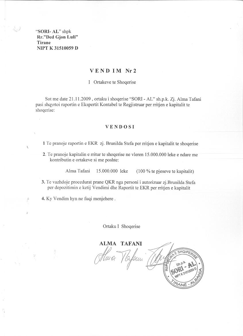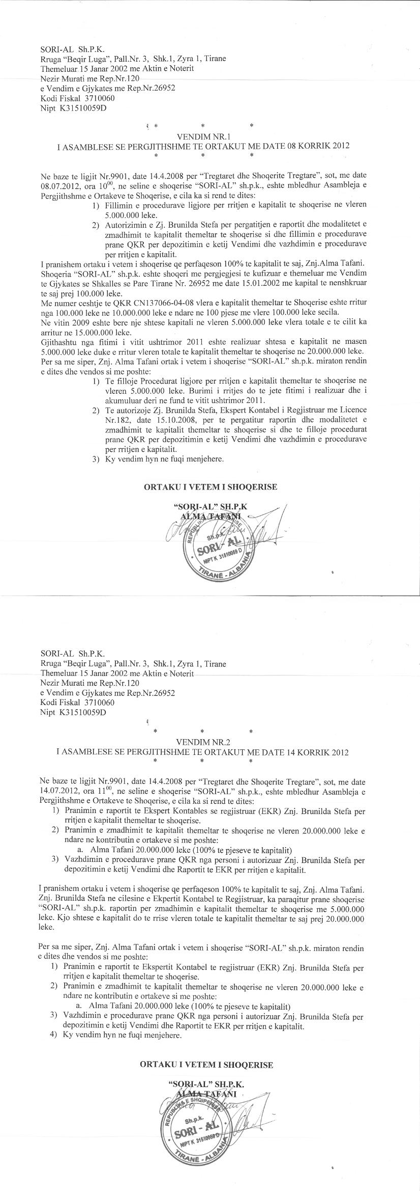 → Ekstrakt historik i regjistrit tregtar 11.06.2021 → Akti i themelimit dhe statuti → Kontrate shitblerje me kusht e kuotave te kapitalit 03.12.2019 → Kontrate per shitjen e kuotave 19.03.2007 → Vendimi i asamblese se ortakeve per rritjen e kapitalit 08.07.2012 → Vendim per rritjen e kapitalit 21.11.2009 → Vendim i asamblese se ortakeve per rritjen e kapitalit 16.05.2019 → Vendim i ortakut per rritjen e kapitalit 06.07.2017 → Vendimi i ortakeve te shoqerise per rritjen e kapitalit 24.05.2015 → Vendimi i ortakut te shoqerise per rritjen e kapitalit 08.09.2016 → Revokim i kontrates se shit-blerjes me kusht te kuotave, date 14.12.2020 → Ekstrakti Historik i Regjistrit Tregtar date 20.08.2024 |