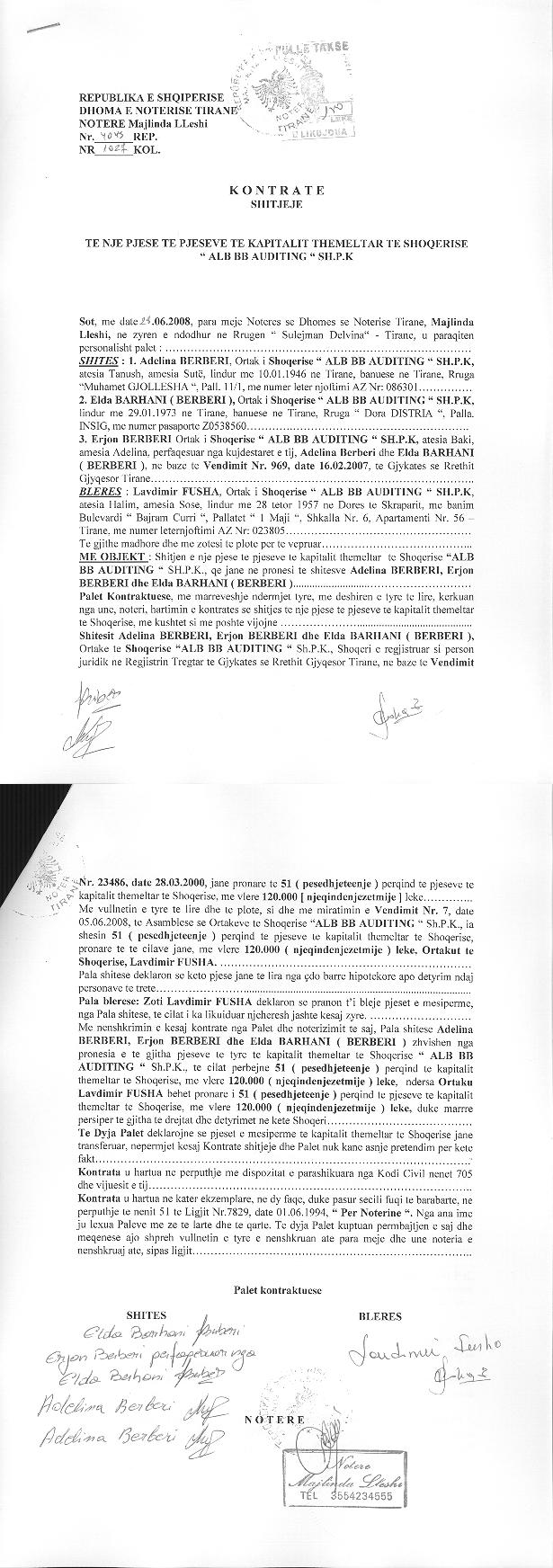 → Ekstrakt Historik i Regjistrit Tregtar date 03.03.2023 → Akt themelimi dhe Statuti i Shoqerise → Vendim i Gjykates se Shkalles se pare Tirane, Leshimi i Deshmise se Trashegimise Ligjore date 19.01.2005 → Kontrate Shitje Kuotash date 18.07.2005 → Kontrate Shitje Kuotash date 05.12.2005 → Kontrate Shitje Kuotash date 05.12.2005 → Kontrate Dhurimi Kuotash date 16.03.2006 → Vendim i Gjykates se Shkalles se pare Tirane, Leshimi i Deshmise se Trashegimise Ligjore date 03.07.2006 → Kontrate Shitje Kuotash date 29.06.2008 → Kontrate Shitblerje Kuotash date 30.01.2012 → Vendim i Asamblese se Ortakeve, Zmadhim Kapitali date 16.07.2013 → Kontrate Dhurimi Kuotash date 01.06.2017 |