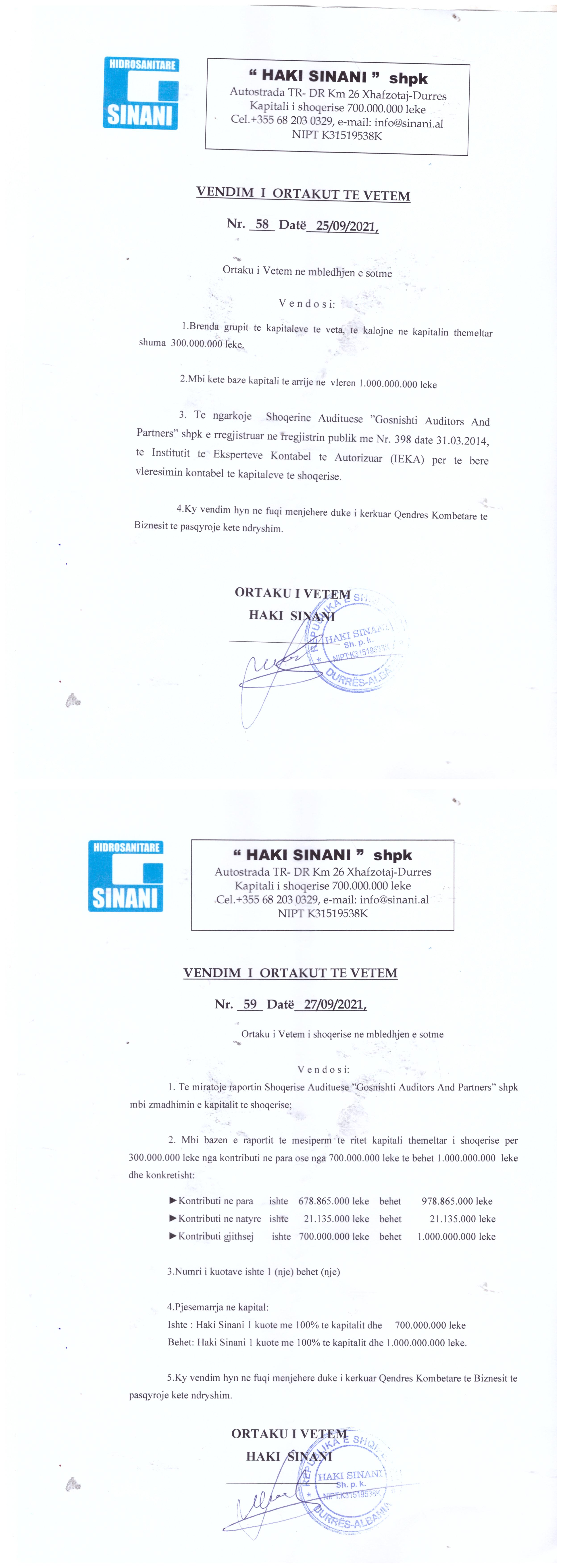 → Ekstrakt historik i regjistrit tregtar date 18.11.2023 → Vendim i ortakut te vetem date 25.09.2021 → Vendim i ortakut te vetem per zmadhimin e kapitalit date 28.12.2011 → Vendim i ortakut te vetem per zmadhim kapitali date 15.06.2015 → Procesverbal i celjes se testamentit date 30.11.2021 |