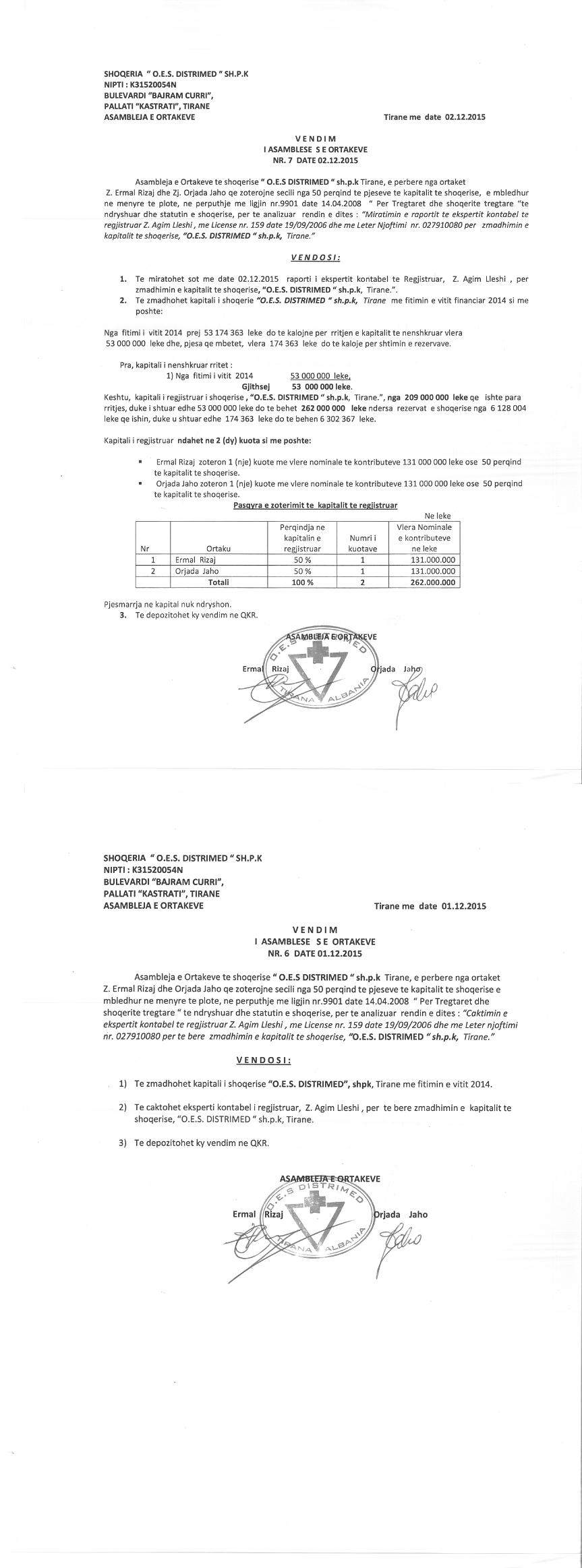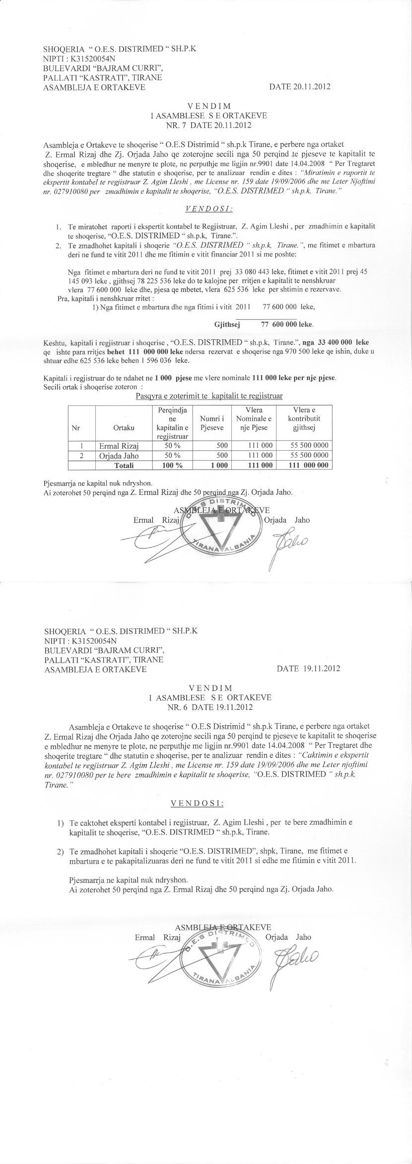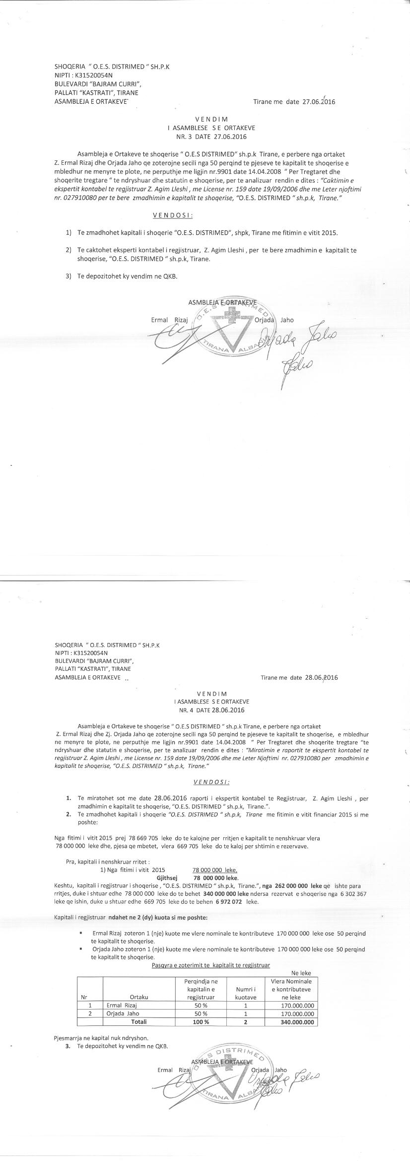 → Ekstrakt historik i regjistrit tregtar 24.06.2021 → Akti i themelimit → Raport mbi rritjen e kapitalit 06.06.2008 → Vendim i asamblese se ortakeve per rritjen e kapitalit 03.12.2018 → Vendim i asamblese se ortakeve 20.11.2012 → Vendimi i asamblese se ortakeve per zmadhimin e kapitalit 27.06.2016 → Vendimi i asamblese se ortakeve per rritjen e kapitalit 02.12.2015 → Vendimi i asamblese se ortakeve per zvogelimin e kapitalit 13.05.2019 → Ekstrakt Historik i Regjistrit Tregtar date 24.09.2024 → Ekstrakt Historik i Regjistrit Tregtar date 09.09.2025 |