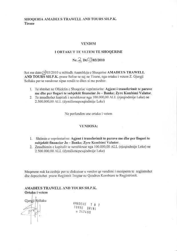 | Objekti i Veprimtarisë: | Ne fushen e transportit ajror, detar, tokesor, agjensi per shitjen e biletave ajrore dhe te shoqerive ajrore, detare, tokesore, ne fushen e turizmit. Agjent i transferimit te parave me dhe per llogari te subjektit financiar jo banke, zyre kembimi valutor. |