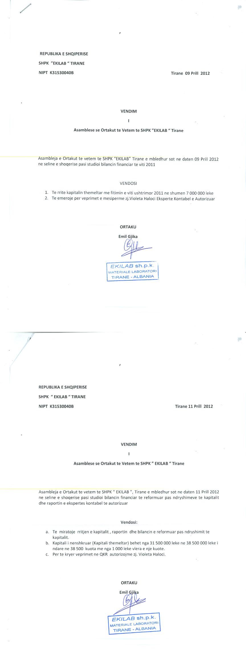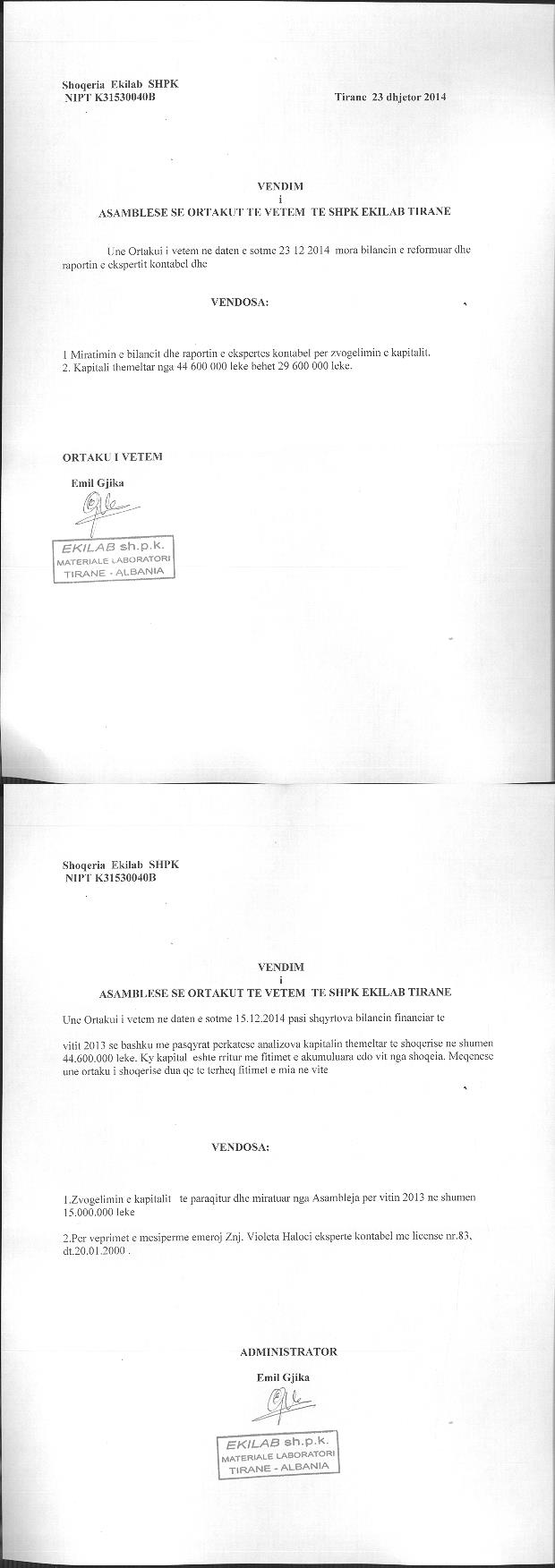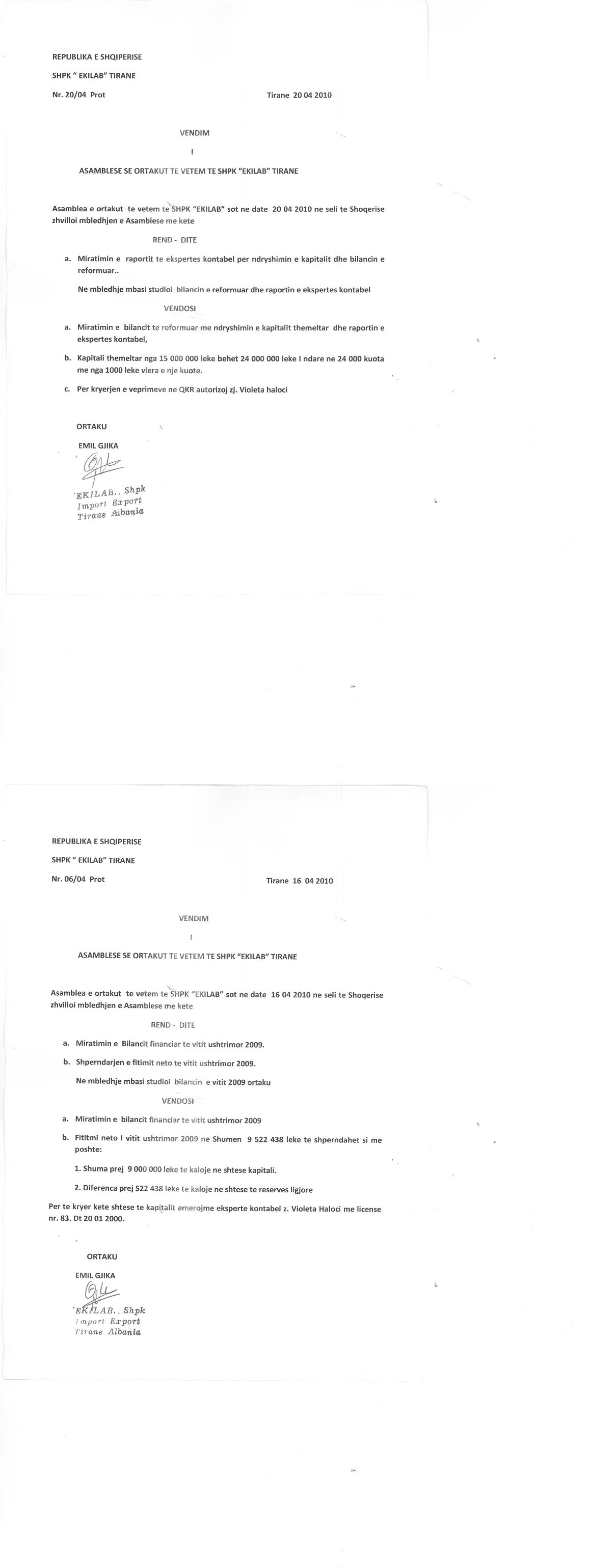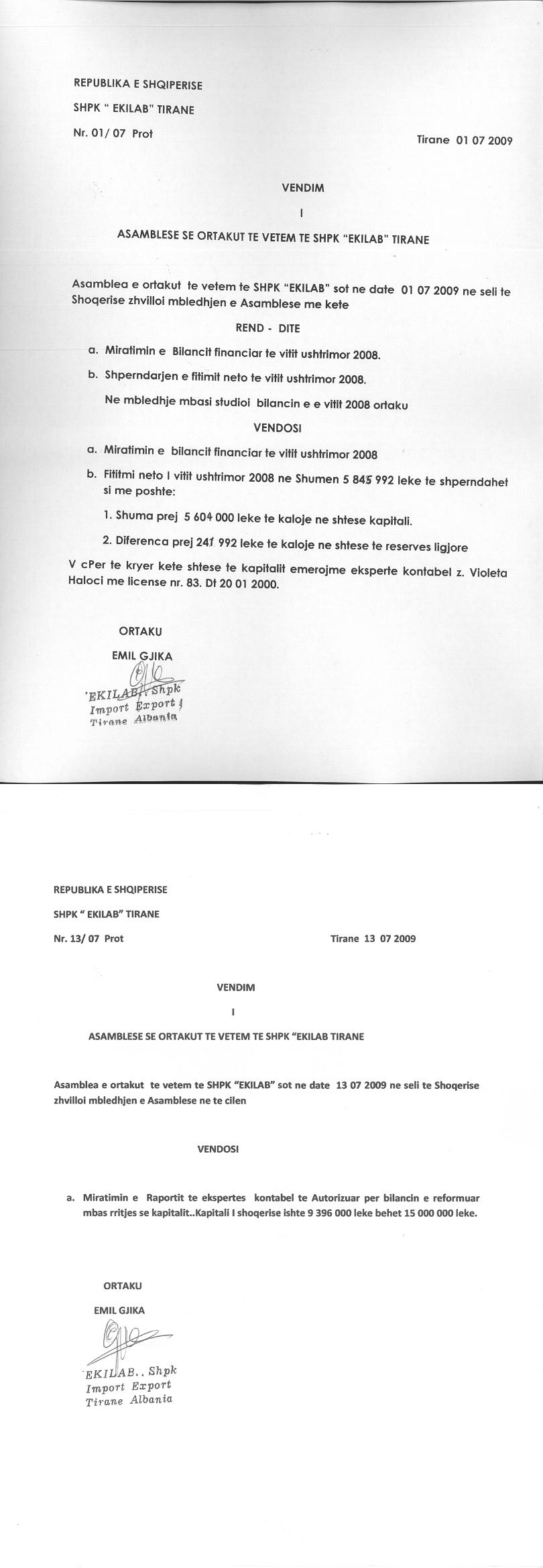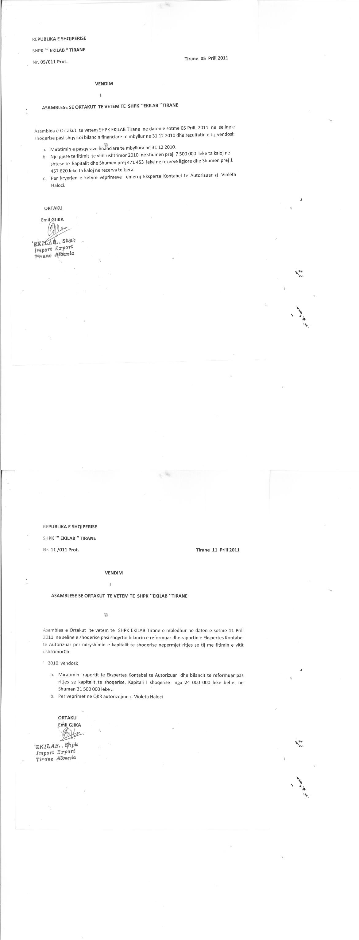 → Ekstrakti Historik i Regjistrit Tregtar date 15.02.2022 → Stauti fillestar i shoqerise dhe dokuenta te ndryshem → Statuti i Shoqerise → Vendim i asamblese se ortakut te vetem date 13.07.2009 → Vendim i asamblese se ortakut te vetem date 20.04.2010 → Vendim i asamblese se ortakut te vetem date 11.04.2011 → Vendimit i asamblese se ortakut te vetem date 11.04.2012 → Vendim i asamblese se ortakut te vetem date 26.06.2013 → Vendim i asamblese se ortakut te vetem date 15.12.2014 → Vendim i asamblese se ortakut te vetem date 12.07.2019 → Kontrate e Shitjes se Kuotave date 05.11.2020 → Kontrate e transferimit te Kuotave date 04.11.2021 |