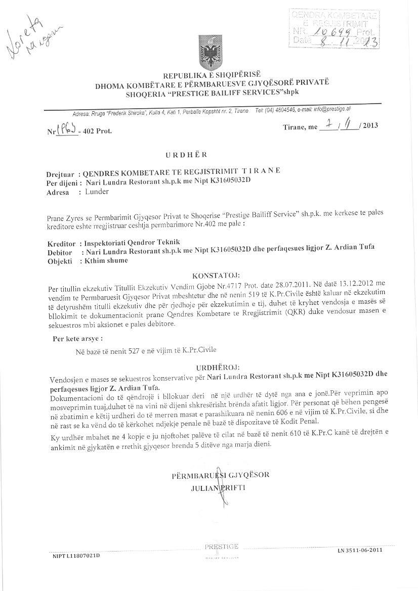 | Çështje Ligjore: | I. Me datë 28.10.2013, me anë të urdhërit Nr.10349 Prot, Nr.Dosje 732, lëshuar nga Shoqëria Përmbaruese private“E.P.S.A”,Sh.P.K, u urdhërua: Vendosja e masës së sekuestros konservative mbi kuotat e debitorit , shoqëria “NariLundra”,sh.p.k me Nipt K 31605032 D përf.Ardian Tufa, si dhe mbi të drejtat që rrjedhin