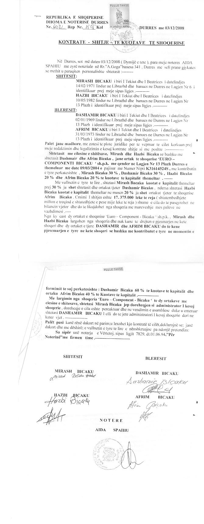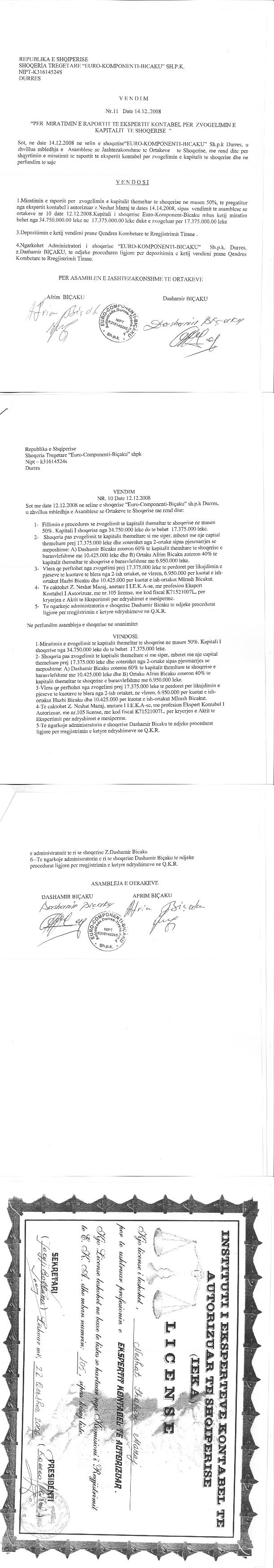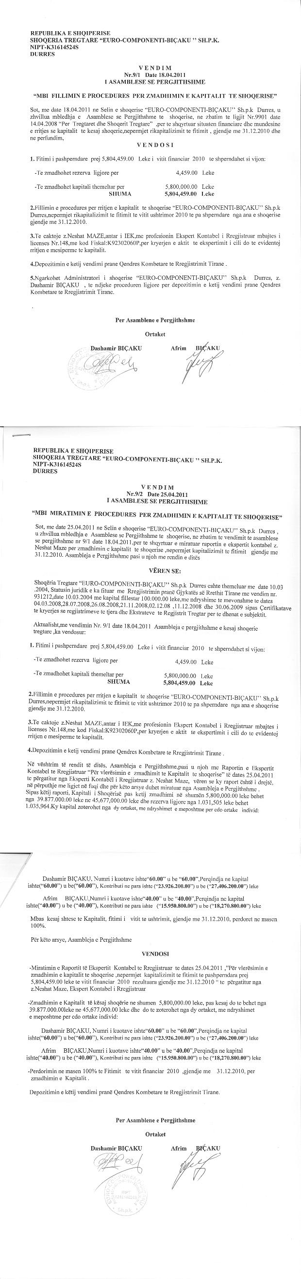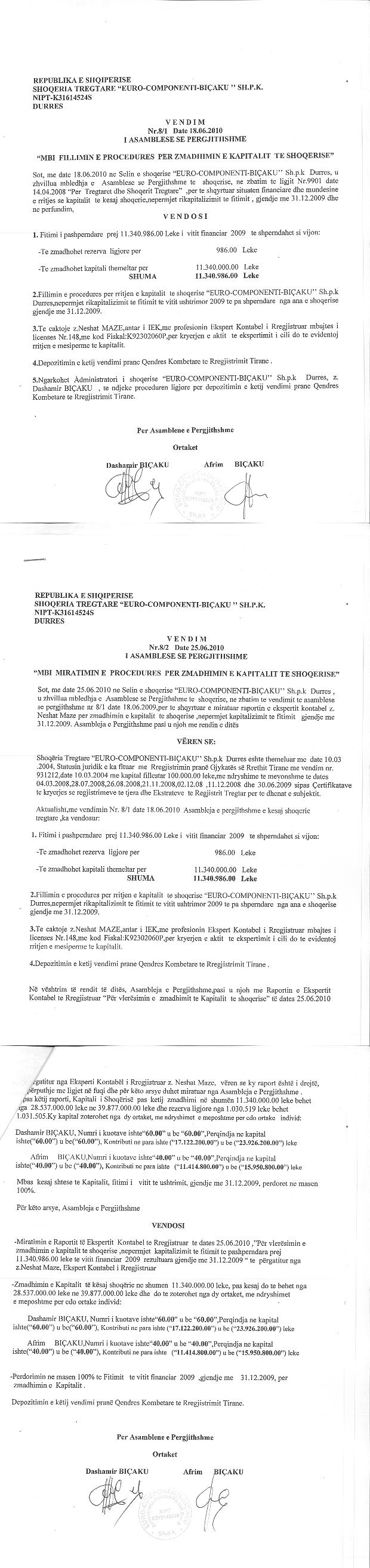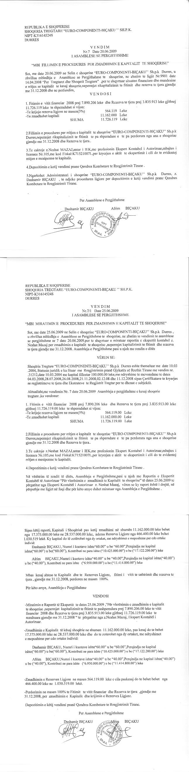 | Çështje Ligjore: | Bashkimi me Perthithje Me date 14.05.2012, me Vendim te Asamblese se Pergjithshme te ortakeve te shoqerise, eshte miratuar bashkim me perthithje midis shoqerive " EURO- COMPOTENTI- BIÇAKU " sh.p.k. dhe "MOBILERI -BIÇAKU " sh.p.k. Sipas ketij vendimi " EURO- COMPOTENTI- BIÇAKU " sh.p.k. do te jete shoqeri perthithese, ndersa "MOBILERI -BIÇAKU " sh.p.k eshte shoqeria e perthithur. Baza e nisjes per bashkimin jane treguesit e bilancit te date 31.12.2011, ndersa aktiviteti i vitit 2012 do te konsiderohet i perbashket. Pas bashkimit me perthithje ortake te shoqerise jane Dashamir Biçaku me 30%, Mirash Biçaku me 30%, Hazbi Biçaku me 20% dhe Afrim Biçaku me 20% te kuotave te shoqerise. Kapitali aksionar ne shoqerine e re do te jete 68.173.400 Leke.Te drejtat dhe detyrimet e shoqerise "MOBILERI -BIÇAKU " sh.p.k do ti kalojne shoqerise " EURO- COMPOTENTI- BIÇAKU " sh.p.k. |