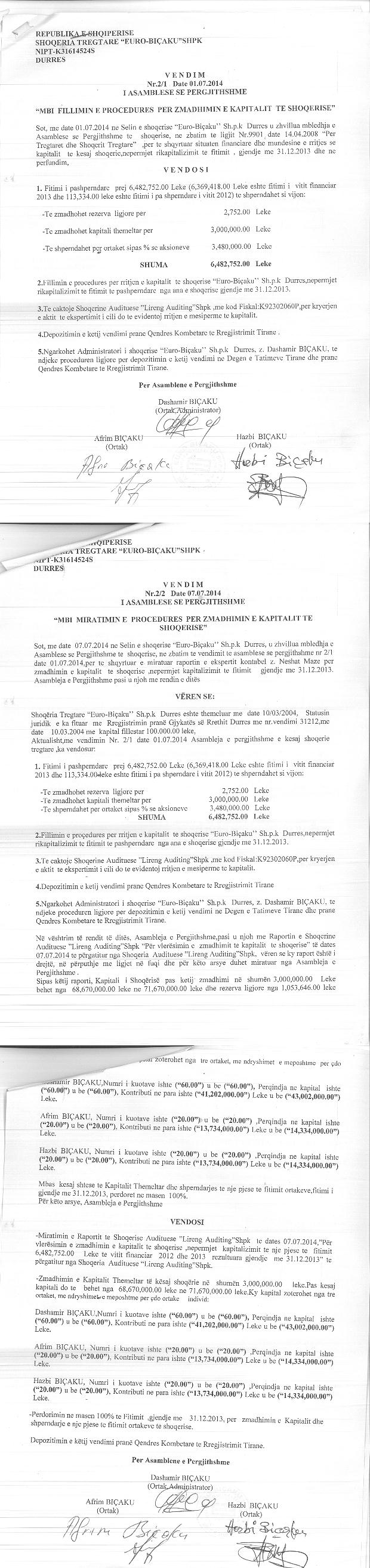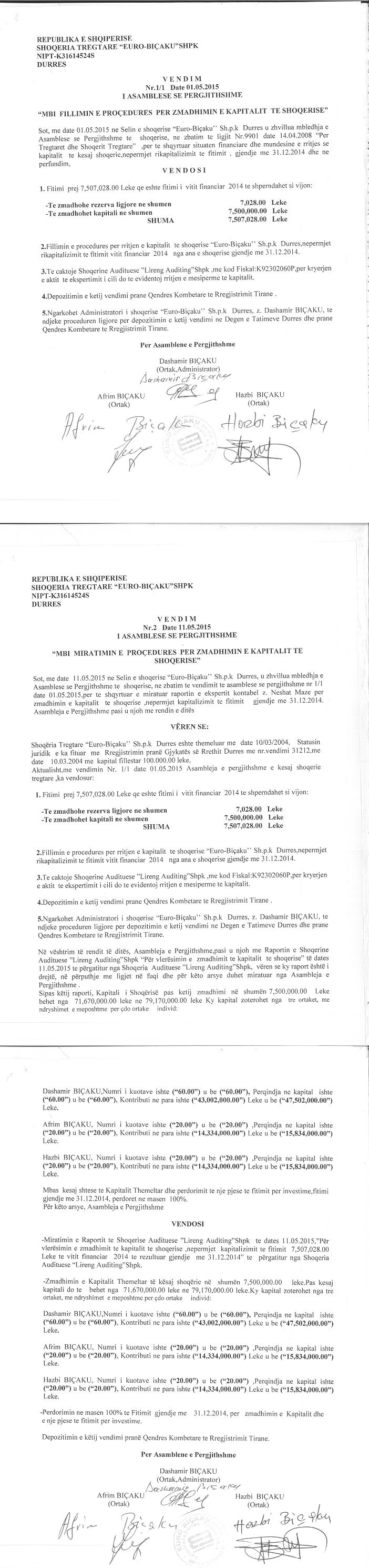 → Ekstrakti Historik i Regjistrit Tregtar date 27.08.2024 → Statuti fillestar i shoqerise dhe dokumenta te ndryshem → Statuti i perditesuar i shoqerise → Statuti i shoqerise pas bashkimit me perthithje te shoqerive MOBILERI -BIÇAKU sh.p.k dhe EURO - BIÇAKU → Raporti i ekspertit kontrabel date 30.10.2007 → Raporti i ekspertit kontrabel date 20.08.2008 → Kontrate e Shitjes se Kuotave date 30.06.2008 → Kontrate e Shitjes se Kuotave date 03.12.2008 → Vendimi i Asamblese se Ortakeve date 12.12.2008 → Vendimi i Asamblese se Pergjithshme date 25.06.2009 → Vendim i Asamblese se Pergjithshme date 25.06.2010 → Vendim i Asamblese se Pergjithshme date 25.04.2011 → Vendim i Asamblese se shoqerise date 14.05.2012 → Vendim i Asamblese se shoqerise date 30.05.2012 → Kontrate e Shitjblerjes se Kuotave date 22.02.2013 → Vendim i Asamblese se shoqerise date 20.05.2013 → Vendim i Asamblese se Pergjithshme date 07.07.2014 → Vendim i Asamblese se Pergjithshme date 11.05.2015 → Vendim i Asamblese se Pergjithshme date 31.05.2016 → Vendim i Asamblese se Pergjithshme date 31.05.2017 → Vendim i Asamblese se Pergjithshme date 10.06.2018 → Vendim i Asamblese se Pergjithshme date 24.06.2019 → Vendim i Asamblese se Pergjithshme date 10.07.2020 → Kontrate e dhurmit te Kuotave date 10.09.2020 → Vendim i Asamblese se Pergjithshme date 10.06.2022 → Kontrats e shitjes se kuotave date 19.07.2022 → Vendim i Asamblese se Pergjithshme date 08.06.2023 → Vendim i Asamblese se Pergjithshme date 10.07.2024 → Projekti per bashkimin me perthithje te shoqerive MOBILERI -BIÇAKU sh.p.k. dhe EURO - BIÇAKU |