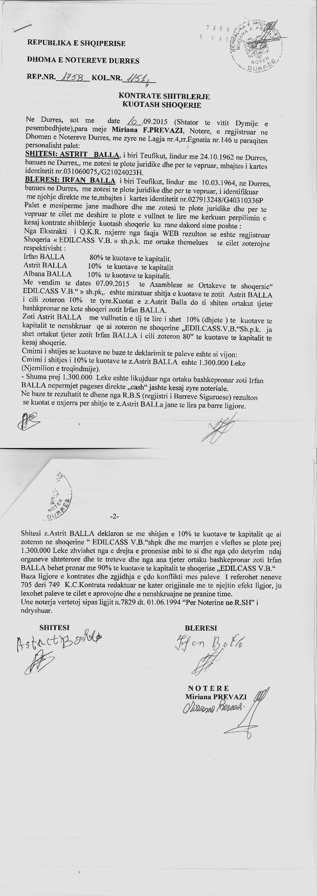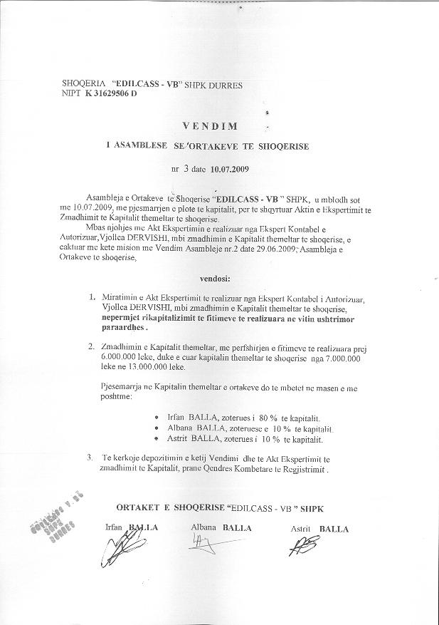 → Ekstrakti Historik i Regjistrit Tregtar date 19.08.2024 → Statuti fillestar i shoqerise dhe dokumenta te ndryshem → Statuti i perditesuar i shoqerise → Vendim i Asamblese se ortakeve date 07.11.2007 → Vendim i Asamblese se ortakeve date 10.07.2009 → Kontrate e Shitblerjes se Kuotave date 10.09.2015 → Vendim i Asamblese se ortakeve date 31.05.2019 |