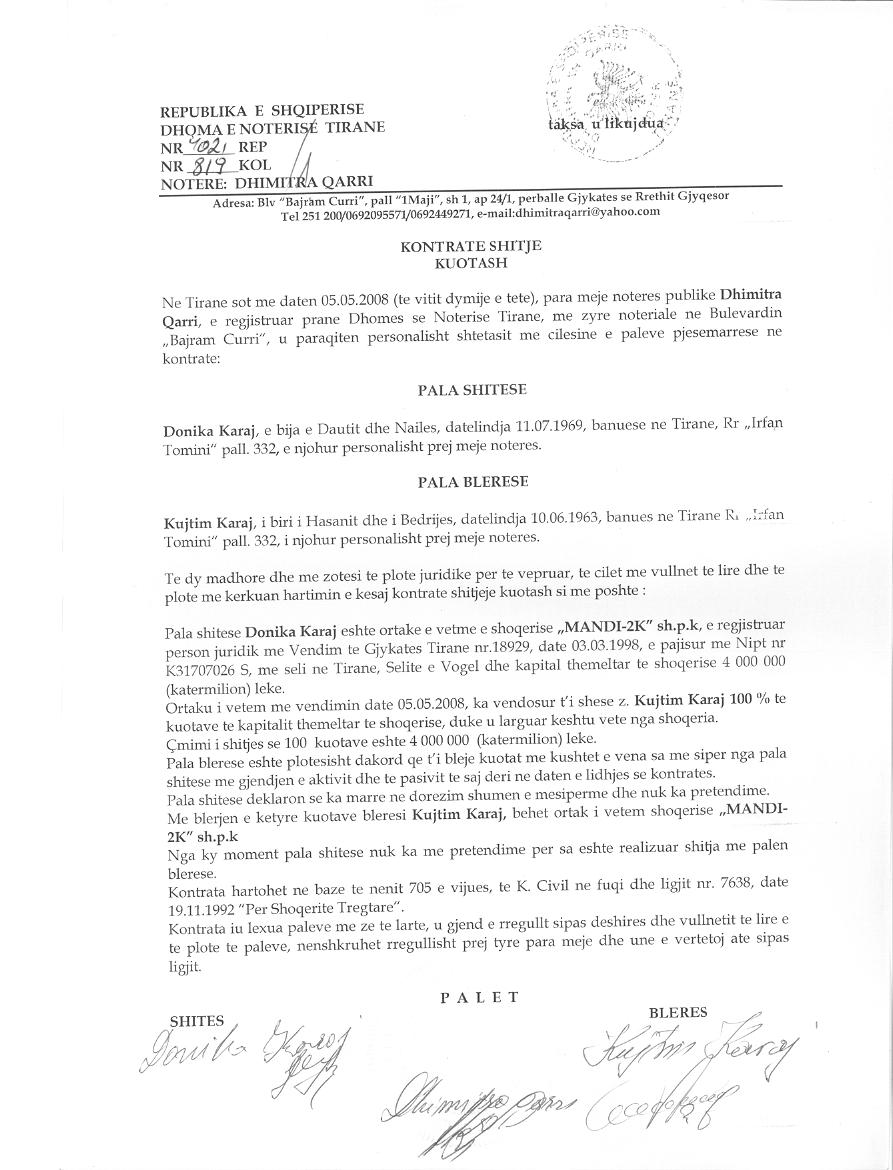 → Ekstrakt historik i regjistrit tregtar date 26.10.2021 → Akti i themelimit dhe statuti → Vendimi i asamblese se ortakeve per shtesen e kapitalti date 31.08.2018 → Kontrate dhurimi kuotash date 13.07.2004 → Kontrate shitje kuotash date 05.05.2008 |